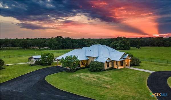 A rare and remarkable opportunity awaits just minutes from Texas A&M and Kyle Field-this 112-acre ranch is a picturesque retreat that seamlessly blends functionality with charm. At the heart of the estate is a stately 3,312 SF main residence, offering 5 bedrooms and 4.5 baths with resort style pool. Nearby, a beautifully designed 4,800 SF barndo provides additional living space with a full kitchen, wet bar, along with two bedrooms and 2.5 baths. Thoughtfully designed for both comfort and functionality, the property includes 15 small sheds for animal breeding, a 30x50 equipment barn, and a 40x40 horse barn. Equestrian enthusiasts will delight in the round pen and riding arena. Water features include 1-acre stocked pond complete with an aluminum dock for peaceful fishing moments and Ferrill Branch Creek meanders through the back wooded section of the property. The ranch is fully enclosed by an 8-ft galvanized high fence with a 4-ft varmint wire and hot wire. Security cameras are strategically placed throughout, ensuring peace of mind. Currently operating as an exotic game breeding business, the ranch offers numerous revenue opportunities, with additional potential for horse boarding, livestock operations, short-term rentals, or a distinguished event venue. A truly exceptional offering, this ranch is a sanctuary of beauty, versatility, and opportunity-an investment destined to be treasured for generations.