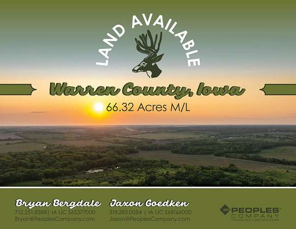 Peoples Company is proud to present 66.32 surveyed acres located just south of Des Moines in Warren County, Iowa. This diverse property features mature oak and walnut timber, open grass clearings, and a scenic 3.5-acre pond with depths reaching 15 feet. Of the total acreage, approximately 4.06 acres are FSA cropland.