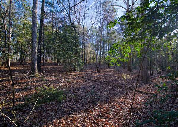 The land features gently rolling terrain with an approximate slope ranging from 2% to 15%, offering natural elevation changes and a landscape that includes mature loblolly pine, oak, hickory, sweetgum, and native understory vegetation typical of the region.