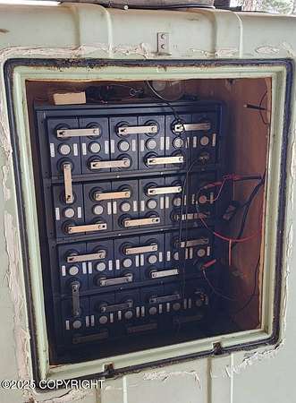 A small battery bank with an inverter charger from a solar panel on the wall above the deck facing west.