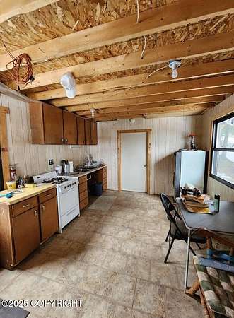 There is an open kitchen with a gas stove and refrigerator, plenty of counter space, and cabinets.