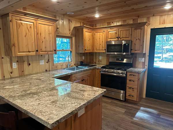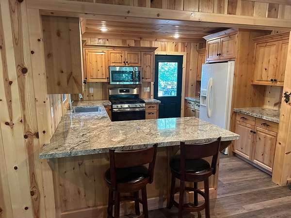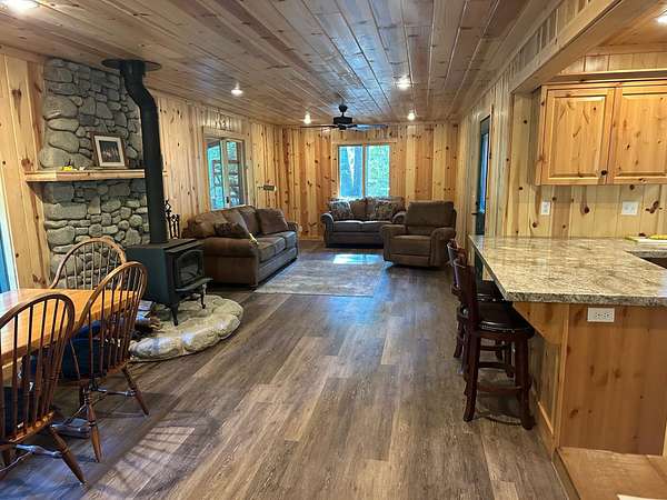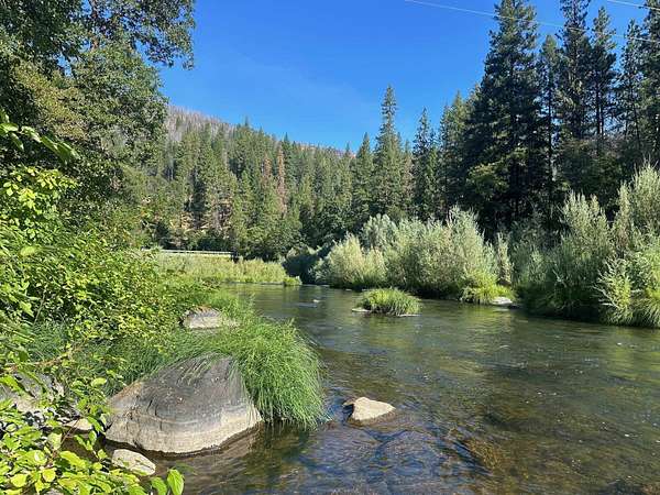 Est $2,142/moLISTING #: 210H- 240+' OF FEATHER RIVER FRONTAGE with this perfect mountain cabin setting. This 2-bedroom, 1-bath home has been substantially remodeled including PINE T & G FINISHES THROUGHOUT, pine kitchen cabinets, granite countertops and all laminate flooring for easy maintenance. Upgrades to the electrical, foundation and plumbing have been done as well. Cozy dining room with view window towards the river. The cabin is on 1.17-acres plus a second, contiguous, 1.10-acre lot to the west is included in this sale makes for a nice buffer or room for another family cabin on the river!!