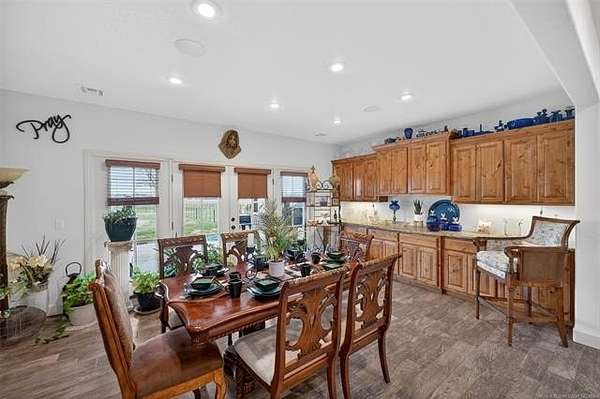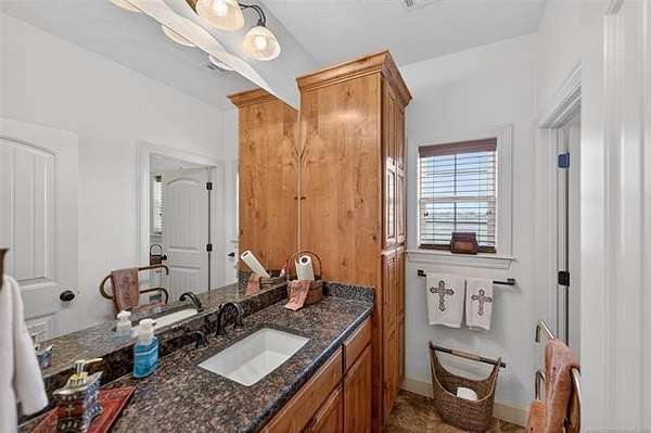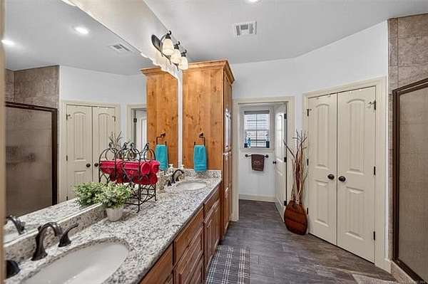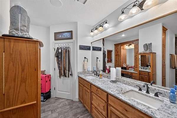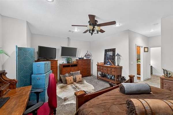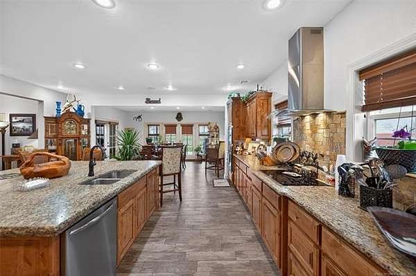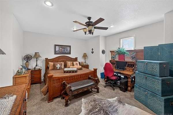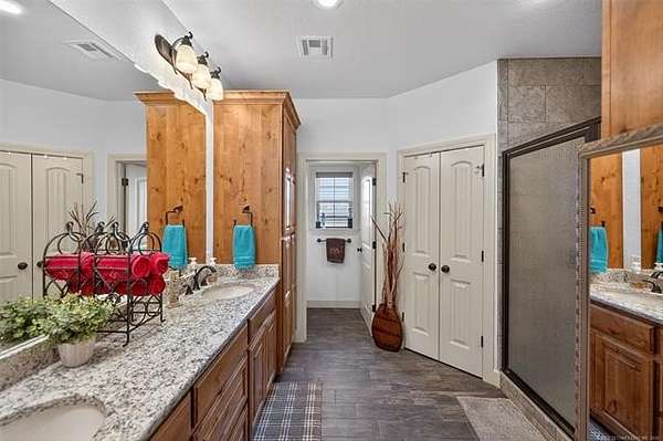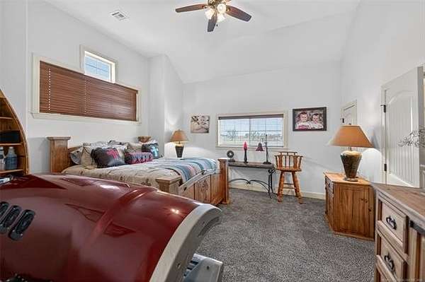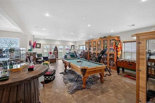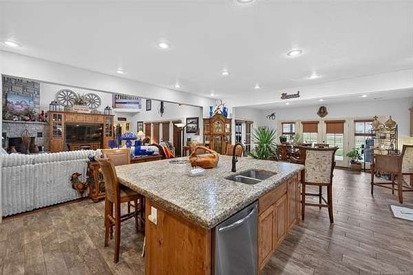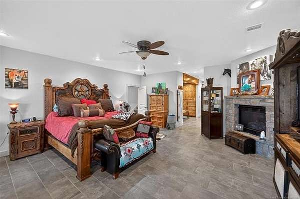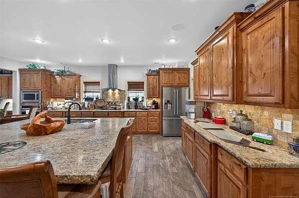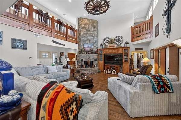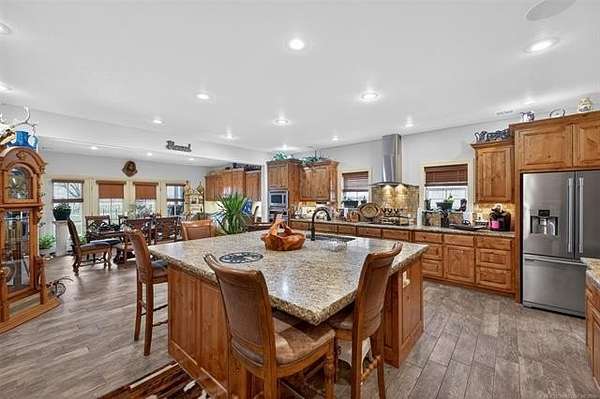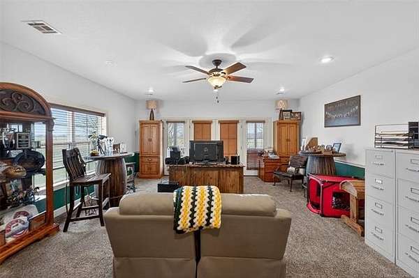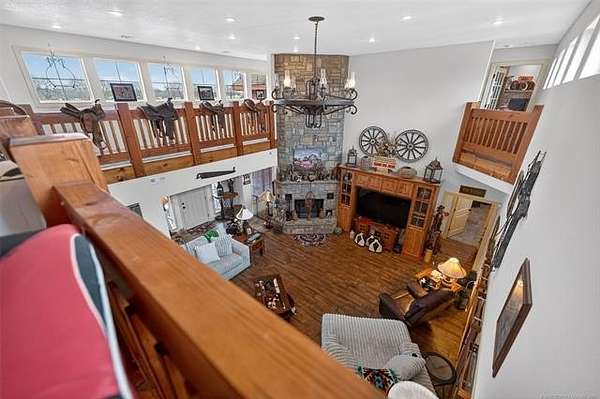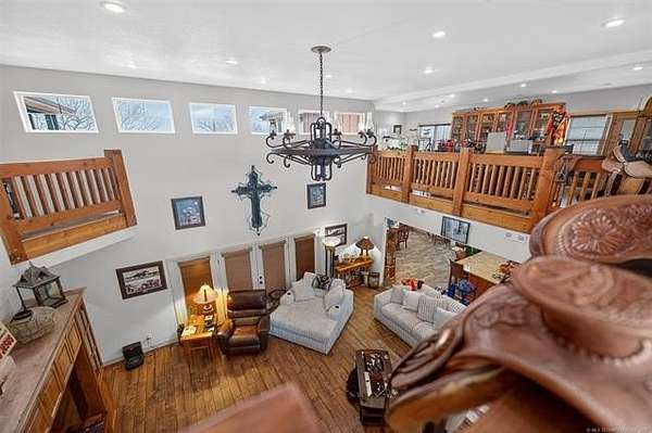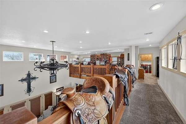 Welcome to a magnificent opportunity to own a premier executive horse farm, perfectly situated on 22.22 acres of meticulously maintained land. This property is not just a home; it's a complete lifestyle package designed for the discerning equestrian and those who demand spacious luxury. The custom-designed residence boasts 5,598 (CH) square feet of unparalleled elegance, featuring 4 spacious bedrooms, 3 full bathrooms, and 2 convenient half bathrooms. The heart of the home is a massive two-story living room, a breathtaking space with soaring ceilings and an elegant upstairs walkway that overlooks the room. This central area flows seamlessly into a very large, chef-inspired kitchen with granite island, and into the formal dining room, creating an ideal setting for both grand entertaining and comfortable everyday living. Retreat to the luxurious main-floor master suite, a sanctuary featuring a large walk-in closet and a spa-like master bath with an enormous walk-in shower complete with rejuvenating rain shower heads. A second downstairs bedroom offers privacy and convenience with its own private ensuite. Upstairs, you will find two additional well-appointed bedrooms, a fantastic game room for recreation, and an outdoor balcony accessed from one bedroom and the game room, offering elevated views of the estate. Practicality meets luxury with an attached three-car garage and a dedicated storm shelter for peace of mind. For the dedicated enthusiast, the equestrian facilities are exceptional. The property features a professional-grade 30x40 horse barn with multiple stalls. In addition, there is a colossal 80x100 red iron shop with a concrete floor, offering endless possibilities for equipment storage, a workshop, or any large-scale project, complemented by a substantial 100-foot lean-to for additional covered space. Experience the perfect blend of luxurious living and world-class facilities