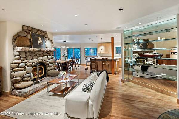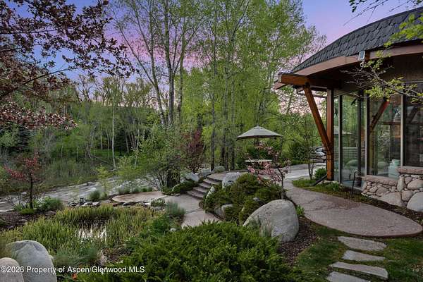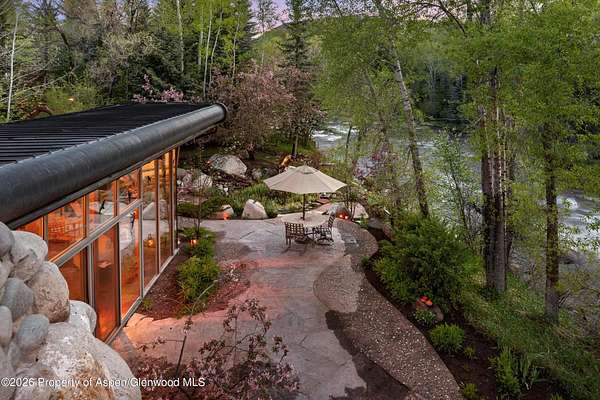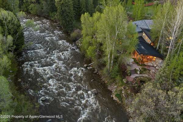 Nestled on two lush acres along the picturesque Roaring Fork River, 730 Twining Flats Road offers an unparalleled riverside living experience. This magnificent property boasts a perfect blend of privacy and convenience, with a prime location just 10 minutes from Aspen and Snowmass. Upon arrival, the private and peaceful setting with lush landscaping and the soothing sounds of the river welcomes you to this exquisite riverside property. This setting sets the stage for the surreal outdoor settings that await. A grand two-story foyer with a custom wood door greets you, setting the stage for the luxurious interior that lies ahead with stone floors, floor-to-ceiling windows, and a circular staircase with wrought iron railing, creating an elegant prelude. Voluminous windows throughout the home capture the serene river setting, while the expansive patio and fire pit provide the perfect spot to embrace the tranquility of the outdoor space. The sunroom captures the serene river setting with stone, high wood ceilings, and wood beams, creating a truly enchanting space. The open floor plan seamlessly connects the expansive kitchen to the dining area, offering al fresco dining options overlooking the river. The kitchen has two center islands - one with bar seating, a six-burner Wolfe range with griddle, abundant storage, and a butler pantry with refrigerator and freezer, cooktop, sink, and dishwasher. There's also a sitting area off the kitchen with a river rock gas fireplace. As you ascend to the upper level, a loft seating area with vaulted ceilings and built-ins awaits. This space is perfect for unwinding and taking in the breathtaking surroundings. The primary bedroom, situated on the second floor, boasts a private deck overlooking the river, providing a serene backdrop to wake up to. The spacious dressing room, vast primary closet, and a 5-piece bathroom featuring a large vanity and dual sinks ensure both luxury and functionality. Additionally, a workout room with vaulted ceilings, built-in speakers, and access to a private deck completes this exceptional space. Additionally, this exceptional property features two guest suites on the main level, each with unique access to outdoor living spaces, ensuring secluded living spaces for all. The finished garage, storage shed, mud room with elevator, and well-equipped laundry room further enhance the convenience and practicality of this riverside retreat. With its exquisite architecture and an idyllic location perfectly capturing the essence of riverside living, 730 Twining Flats Road beckons you to indulge in the unique life experience along the Roaring Fork River.