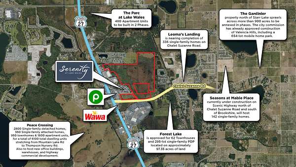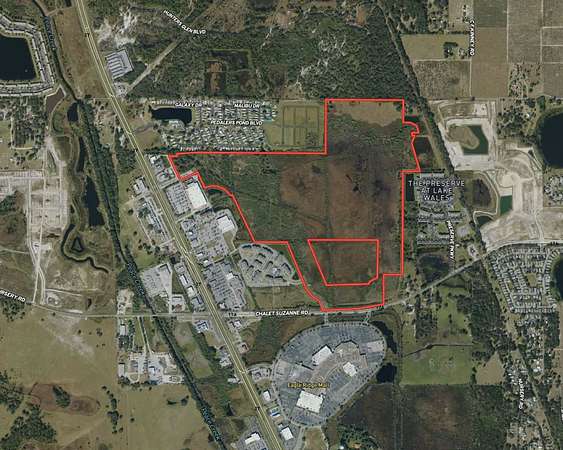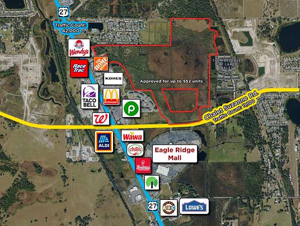 This +-200-acre mixed-use development opportunity is located along the US Highway 27 growth corridor in Lake Wales, Florida and carries Future Land Use designations of Medium Density Residential and Regional Activity Center (RAC). The site features 1,401.30 linear feet of frontage on Chalet Suzanne Rd, creating the potential for an approximately +-15-acre commercial frontage band suitable for neighborhood-serving retail, pads, and service-oriented users, while the balance of the property provides depth for a master-planned residential program including multifamily and single-family components. The property is positioned in a proven daily-needs retail node anchored by Publix, with nearby national and regional users including Aldi, Chili's, Freddy's, Sherwin-Williams, Planet Fitness, Lowe's, and ABC Fine Wine & Spirits, and continued corridor momentum supported by Hampton Inn, a completed Chipotle, Slim Chickens, Starbucks, and a newly completed CubeSmart self-storage facility, along with multiple auto dealerships along US 27. As part of a coordinated development plan, a traffic signal and roadway connection may be achievable, and a prospective buyer is encouraged to meet with the City early to evaluate feasibility, access management criteria, alignment, and timing to maximize commercial exposure and internal circulation. The site is also associated with an approved PDP allowing up to 1,650 dwelling units and an approved 552-unit apartment project, with wetlands described as carrying 6 du/acre density treatment that may allow for density clustering onto uplands (buyer to verify)