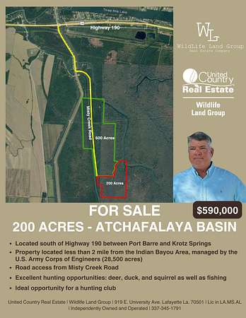 A 200-acre tract that is located between Port Barre and Krotz Springs. This tract is accessible by Misty Creek Road, secluded and in the heart of the Basin. Offers deer, duck, squirrel hunting, and fishing. Great opportunity for a Hunting Club. Listing price for the 200 acre tract is $590,000.