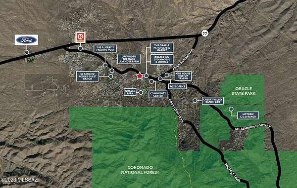 +/- 1 acre Unique Commercial land in beautiful Oracle AZ! Great marketing window with frontage along American Ave, Oracle's main drag. CB-2 commercial zoning in Pinal County. Build your business on this beautiful level lot and put your home on the 10,000 sq. ft lot behind it that is listed with it. Excellent location with good traffic for a business. All utilities are there. Paved access off of American Ave and Evergreen Dr. Great location for any business such as a restaurant or retail. Flat parcel for an easy build. The town of Oracle is at a 4500 ft. elevation and is 7 to 15 degrees cooler than Tucson and Phoenix. This is easily accessible from both cities. Only a quick 20 minutes drive to Oro Valley and Tucson. Take advantage of this unique opportunity.