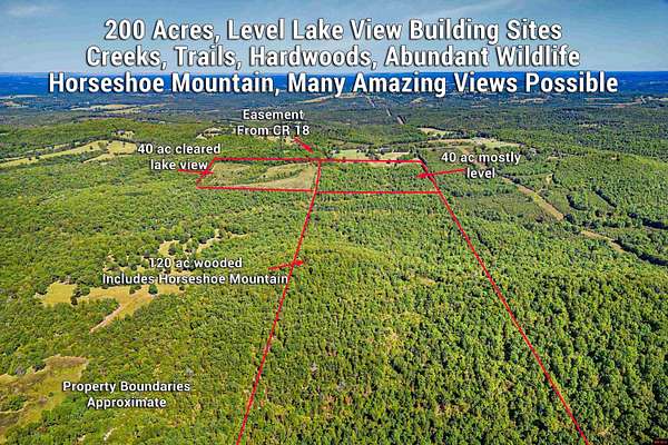 200 acres m/l in North Central Arkansas near Bull Shoals Lake, including "Horseshoe Mountain," cleared pasture, wooded acreage, creeks, valleys, and abundant wildlife. Accessible by recorded easement from CR 18 in northern Baxter County, just a mile from the Missouri border. About 40 acres m/l are cleared for pasture or building sites, some with distant lake views. Another 40 acres m/l of mostly level hardwoods offer potential home sites or additional pasture. The remaining 120 acres m/l feature timber, trails, creeks, and Horseshoe Mountain with potential panoramic views of northern Baxter County and Bull Shoals Lake. No restrictions--ideal for development, hunting, or a private retreat. Just minutes to shopping, dining, medical facilities, and schools in Mountain Home.