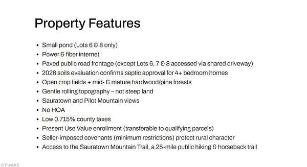 Properties of this caliber are incredibly rare in Stokes County. Part of an exclusive 110-acre, 9-lot community (additional lots available 3.6–31 acres)—all protected by seller-imposed covenants to preserve natural beauty, aesthetics, and rural character. No HOA. This 7.87 acre property contains two lots (1 & 2) located just outside Pinnacle features approx 990 feet of paved public road frontage, power, fiber internet, and percable soils. The field is essentially flat—ideal for your homesite—while views of the Sauratown Mountains provides a stunning backdrop. Enjoy access to the 27+ mile Sauratown Mountain Trail (public hiking/horseback riding). Just 21 minutes to Winston-Salem, 7 minutes to Pilot Mountain. Visit the listing agent's website for details, interactive map, attachments, and video tour.