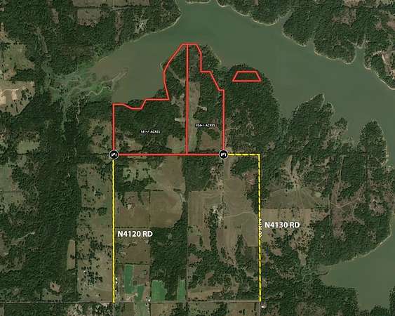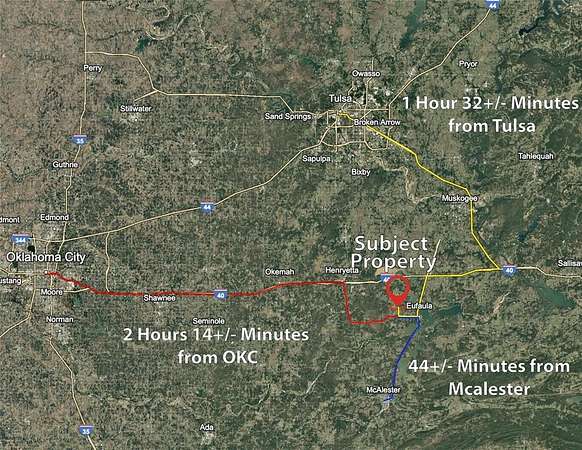 Go W on Selmon Road from Eufaula OK, Go for 5.7 miles, turn R on Northsouth-412, and Go N for 3 Miles. Property entrance is the center (north) gate. GPS gate pin for access is 35.3333934 -95.6808767