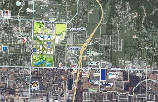 o Parcels can purchased individually or as an assemblage o Immediately adjacent to Bentonville jurisdiction and Walmart Neighborhood Market and Sam's Club o Signalized corner with 37,000 cars per day on W Hudson Rd o 1 mile from the new 350-acre Walmart Home Office campus that employs 15,000+ people per day o 2000' from Interstate I-49 with 108,000 vehicles per day o Flat topography with water on site and sewer across Bekaert Drive o High Barrier to Entry retail corridor (HWY 62 West Hudson Road) o Walking distance to Northwest Arkansas Community College o Seller will move current parking lot off of site o Please note that purchasers of this property will be required to contribute and/or participate in the development of certain adjacent access improvements, ensuring connectivity.