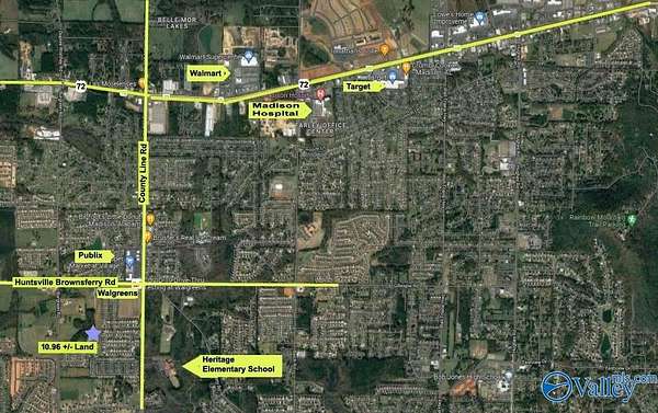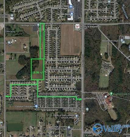 Beautiful 10.96 +/- acres, surrounded by successful Madison city neighborhoods on all sides, would make a great extension to a community or an estate. Land directly borders behind browns ferry crossing, accessible from Belmont place or bakers farm. 1/4 mile from the Publix shopping center on corner of county line rd. & browns ferry rd. Owner has deeded 70 feet easement beside church to connect browns ferry road, or easily accessible from bakers farm on Burgreen rd and Belmont Place on county line. Land can annex into Madison city.