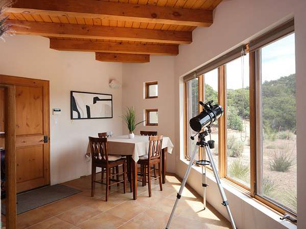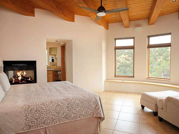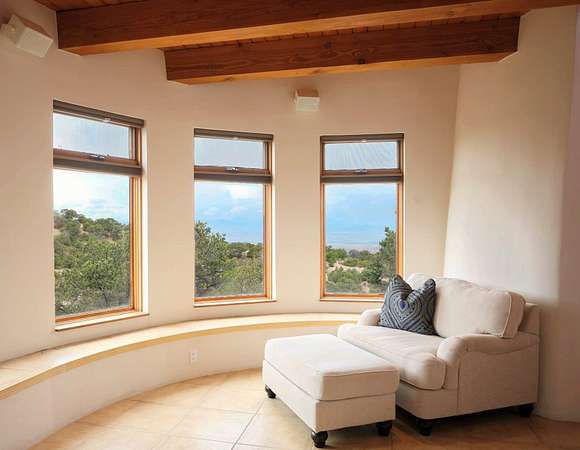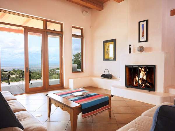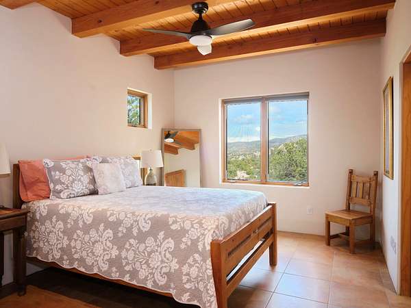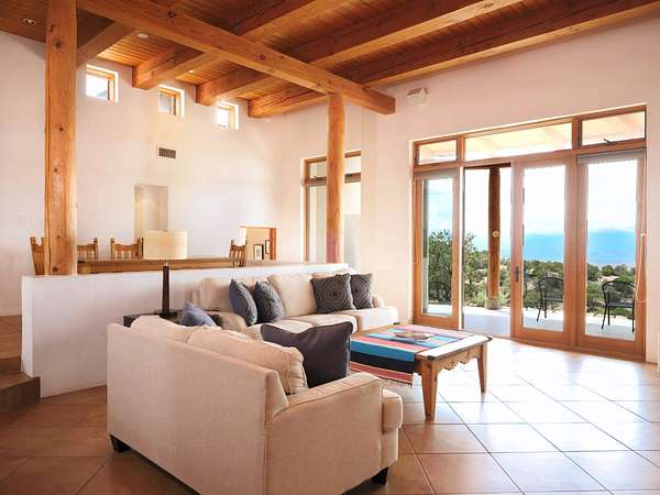 Perched high in the Sangre de Cristo foothills, Casa del Sueno captures the very essence of Northern New Mexico's beauty - endless skies, luminous sunsets, and breathtaking 360-degree mountain views. This 3,300-sq-ft retreat, situated on 10 serene acres, offers complete privacy yet is conveniently located just 35 minutes from Santa Fe and the Opera, 35 minutes from Los Alamos, and 75 minutes from Taos. Designed for both intimate living and effortless entertaining, the home features four bedrooms and three baths, including a primary suite with fireplace and panoramic views, and a separate guest suite ideal for guests. The chef's kitchen opens to inviting living spaces framed by picture windows and natural light, while a rooftop deck provides a front-row seat to sunsets over the Jemez Mountains. Modern amenities include Starlink high-speed internet, a media room, and a fully integrated home sound system. The property features a horse stable and borders miles of pristine trails for hiking, biking, and horseback riding - offering an unparalleled connection to nature without sacrificing convenience or sophistication. A beloved home with a proven record of five-star guest experiences, Casa del Sueno also functions beautifully as a turnkey luxury retreat or second-home investment. From its peaceful mornings to star-filled nights, every moment here is a reminder of why Santa Fe is among the world's most enchanting destinations.