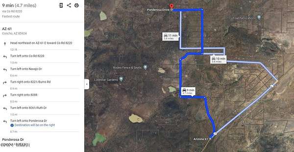 Est $125/mo1 acre corner lot located on CR 8117 and Ponderosa in Concho. This lot is far enough away from town for peace and quiet. 20 minutes to Show Low or Concho Valley either way. Listing agent is a principal of the seller LLC and a licensed broker in the state of Arizona. Property acquired through tax lien foreclosure, so little is known about its history other than what could be obtained through public records. Buyer to verify all material facts during inspection period.