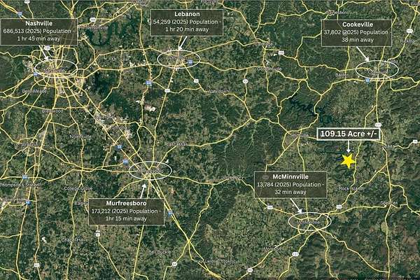 Don't miss this rare opportunity to own 109 UNRESTRICTED acres in scenic Walling, TN! Property is being sold w/out an easement but can buy with easement for additional cost! This expansive, wooded paradise offers the perfect blend of seclusion and potential. Cliff Creek meanders through the property, eventually feeding into the beautiful Caney Fork River just mins away. With rolling hills, some flat spots, varied elevation, and dense woods, it's a dream setting for hunters, campers, or anyone craving a private escape into nature. Marketable timber offers income potential for those looking to log. Located just 15 minutes from Rock Island State Park, 20 minutes to downtown Sparta, 35 minutes to Cookeville, and only 1.5 hours from Nashville International Airport. Whether you envision an off-grid retreat, a hunting haven, or simply a smart investment, this land delivers on all fronts. Come explore the possibilities and see the raw beauty for yourself-your Tennessee adventure begins here!