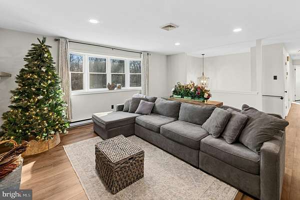Welcome to Haven on Cross Creek Lane, a warm and inviting retreat set on 3.59 private, flat acres in scenic Tinicum Township. This thoughtfully updated home blends modern comfort with a peaceful, wooded backdrop and easy access to the area's most beloved outdoor destinations. The freshly painted main level features laminated vinyl plank flooring, recessed lighting, and a sun-filled bay window overlooking the front yard. A brick feature wall with a Regency wood stove insert adds cozy charm to the living room, while the adjacent dining area opens to a two-story deck ideal for entertaining or enjoying sunset views. The well-appointed kitchen offers solid-surface countertops, soft-close cabinetry, tile backsplash, a pull-out pantry, and premium stainless appliances including KitchenAid wall ovens and a Thermador six-burner cooktop. Three bedrooms on the main floor include a comfortable primary suite with an updated bath and frameless glass shower. The finished lower level provides additional living space, a powder room, office/flex space, and access to the oversized two-car garage with kayak storage. Outdoors, the property shines with mature trees, open lawn, and an enclosed garden featuring grapevines, berry bushes, and apple, peach, and pear trees. Enjoy direct access to the creek and canal, along with close proximity to the Delaware River, the Delaware Canal Towpath, Ralph Stover State Park, and Ringing Rocks State Park. Also includes a small parcel on the Delaware River with riparian rights; just minutes from the Lambertville,NJ bridge. A true Bucks County delight, offering comfort, nature, and convenience in one serene setting.