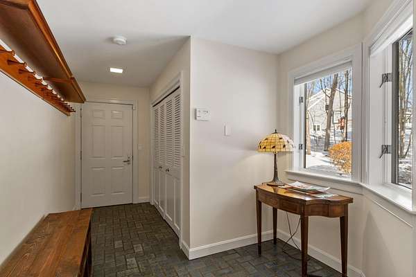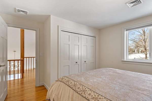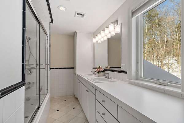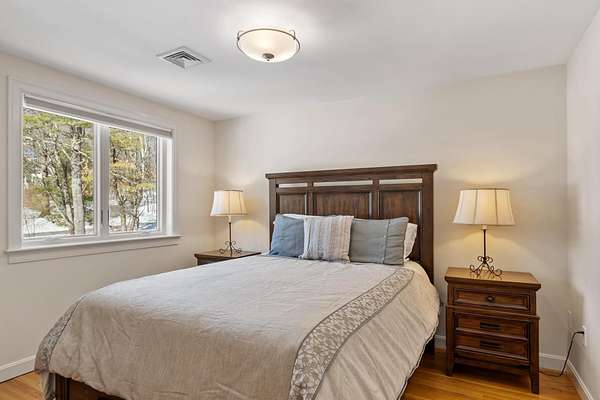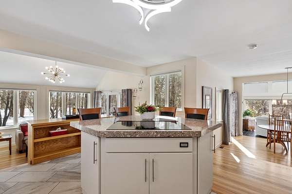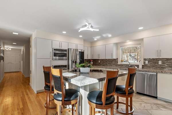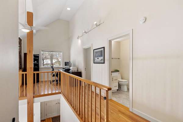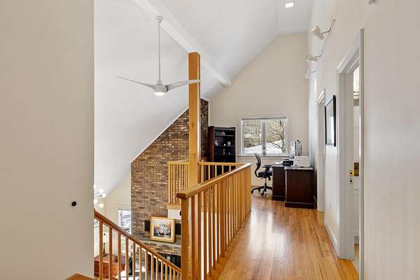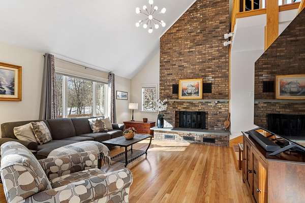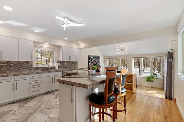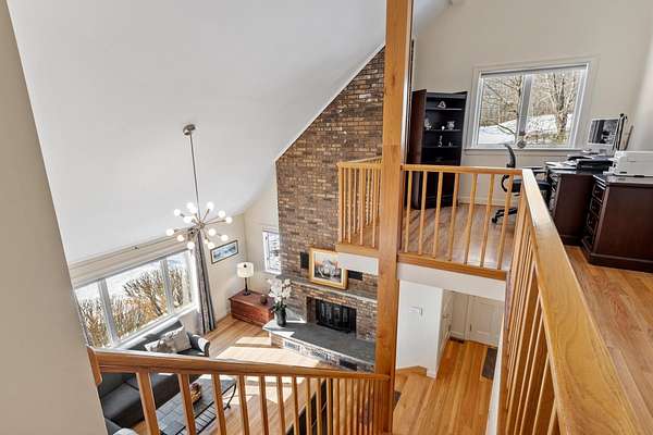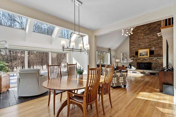 Set on 2.3 private wooded acres in a quiet Hollis neighborhood, this light-filled contemporary blends clean design with thoughtful updates. Expansive windows and new sliding glass doors bring in abundant natural light, highlighting hardwood and tile flooring throughout. The quartz kitchen opens to generous living areas centered around a large wood-burning fireplace. A lofted office overlooks the main space, offering an ideal work-from-home setup. The layout includes four bedrooms and three full baths, including a spacious primary suite with double vanities. Recent improvements add long-term value and peace of mind: young roof and furnace, on-demand hot water, energy-efficient lighting, 10 new windows, replaced sliders, sealed driveway, and added flood lighting. A three-car garage and walk-up basement provide excellent storage and future expansion potential. Sauna and washer/dryer included. Enjoy outdoor living on the private deck surrounded by mature trees. Located in the highly regarded Hollis Brookline school district and just minutes to Nashua and commuter routes, this property offers privacy, space, and contemporary style in one of Hollis' most desirable settings. Delayed showings until open house on 2/21 from 12-2pm. Offers due by Monday 2/23 11pm.
