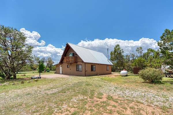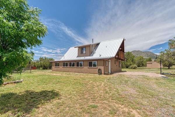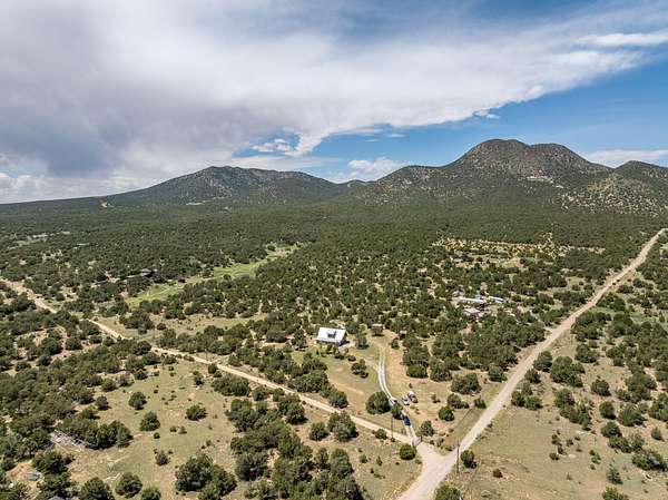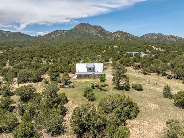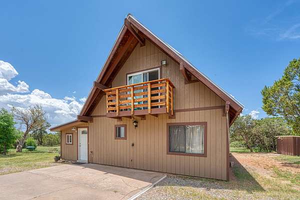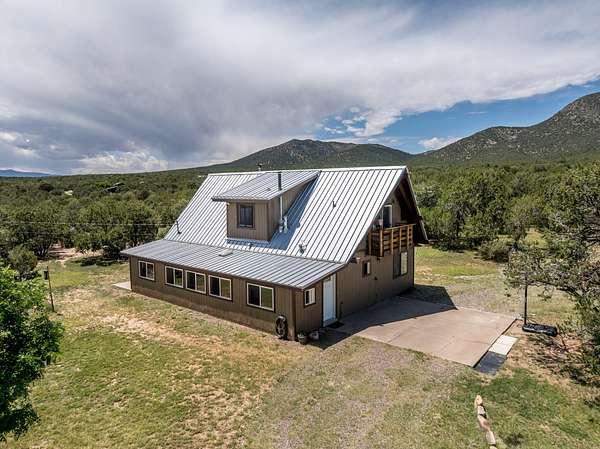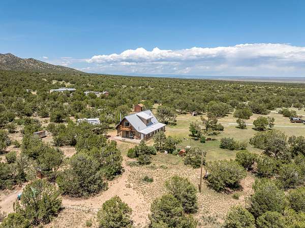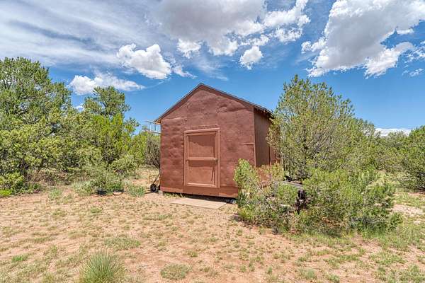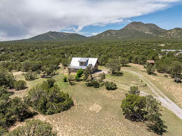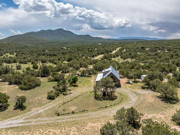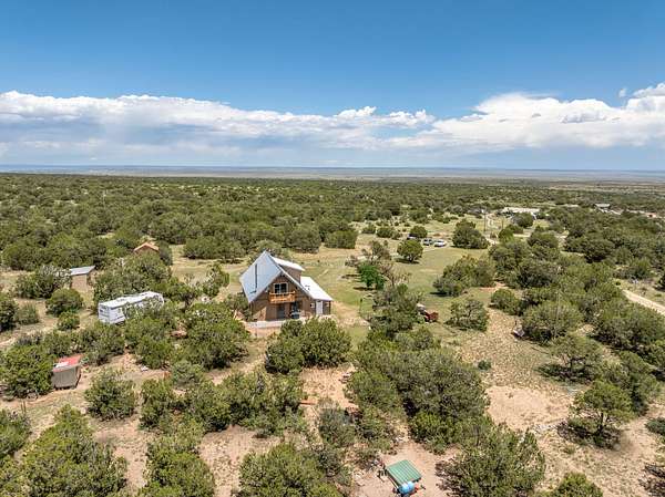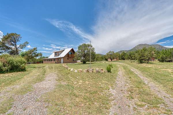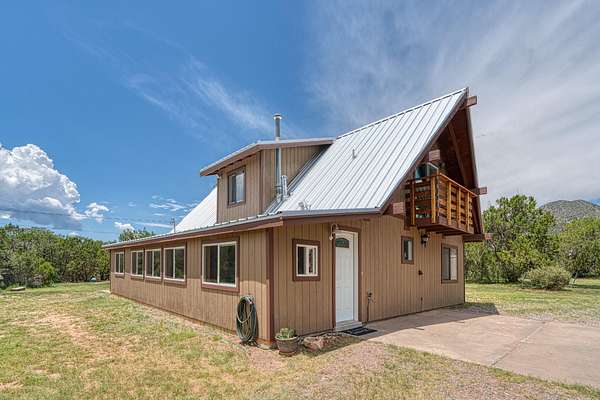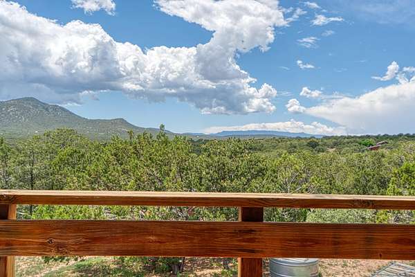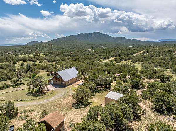 Escape to this peaceful 5-acre country retreat nestled in the San Pedro Mountains just north of Edgewood. This charming A-frame features a main-level primary ensuite plus 2 bedrooms with their own private balconies and a full bath upstairs. Enjoy your morning coffee in the enclosed porch -doubling as a practical mudroom ideal for country life -where you can kick off your boots, store your gear, and take in the peaceful surroundings. The property is fully fenced, wooded yet fairly level with a chicken coop, multiple outbuildings, and a shared well. Wood burning, stove metal roof, tile surround in primary bath, new flooring downstairs and whole-house replumb. Serene setting with breathtaking views & local wildlife. A scenic 45 min to Albuquerque & 1 hr to Santa Fe. Shown by appointment.