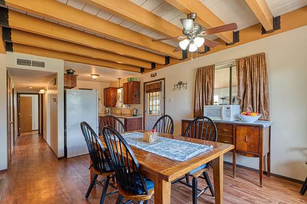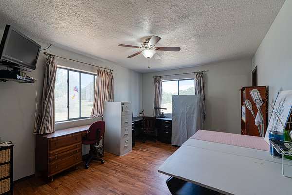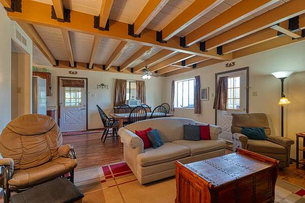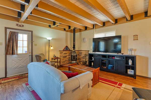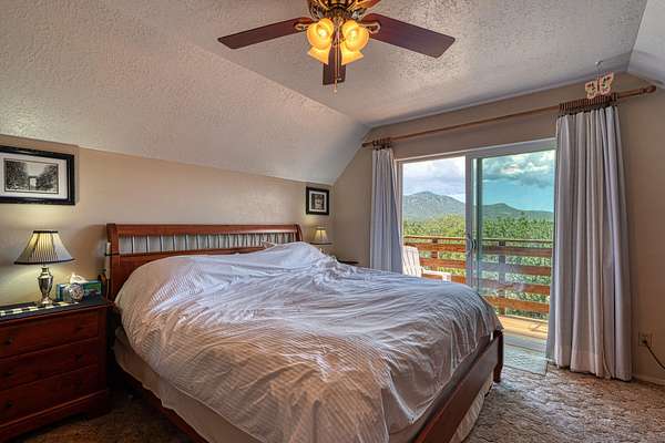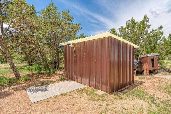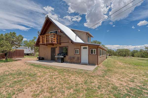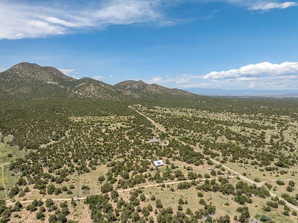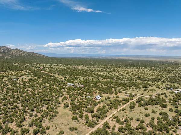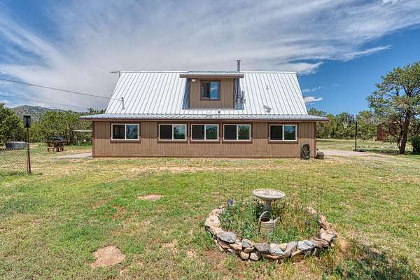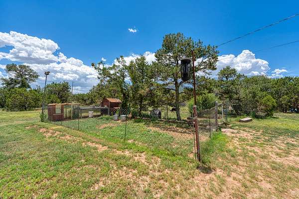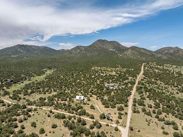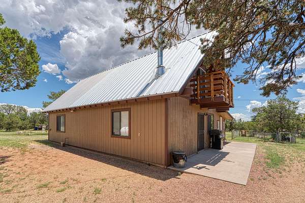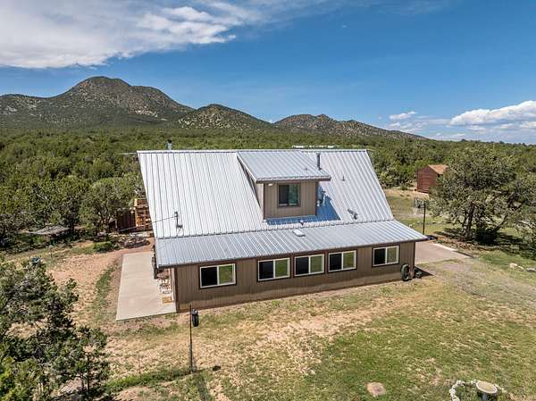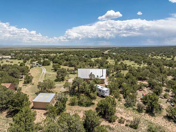 Escape to this peaceful 5-acre country retreat nestled in the San Pedro Mountains just north of Edgewood. This charming A-frame features a main-level primary ensuite plus 2 bedrooms with their own private balconies and a full bath upstairs. Enjoy your morning coffee in the enclosed porch -doubling as a practical mudroom ideal for country life -where you can kick off your boots, store your gear, and take in the peaceful surroundings. The property is fully fenced, wooded yet fairly level with a chicken coop, multiple outbuildings, and a shared well. Wood burning, stove metal roof, tile surround in primary bath, new flooring downstairs and whole-house replumb. Serene setting with breathtaking views & local wildlife. A scenic 45 min to Albuquerque & 1 hr to Santa Fe. Shown by appointment.