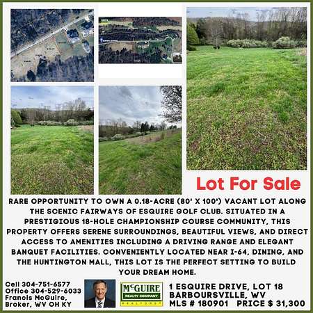 Est $224/moRare opportunity to own a 0.18-acre (80' x 100') vacant lot along the scenic fairways of Esquire Golf Club. Situated in a prestigious 18-hole championship course community, this property offers serene surroundings, beautiful views, and direct access to amenities including a driving range and elegant banquet facilities. Conveniently located near I-64, dining, and the Huntington Mall, this lot is the perfect setting to build your dream home.