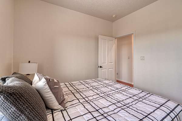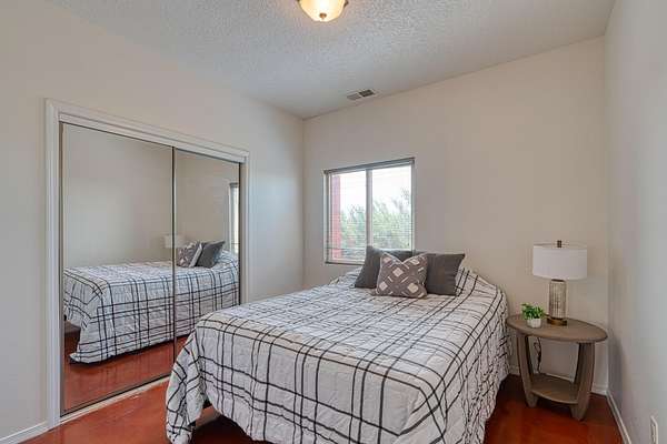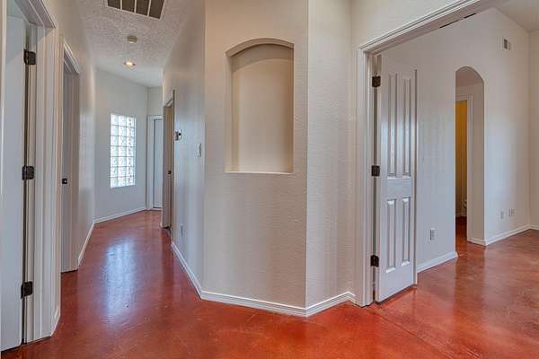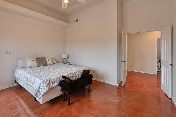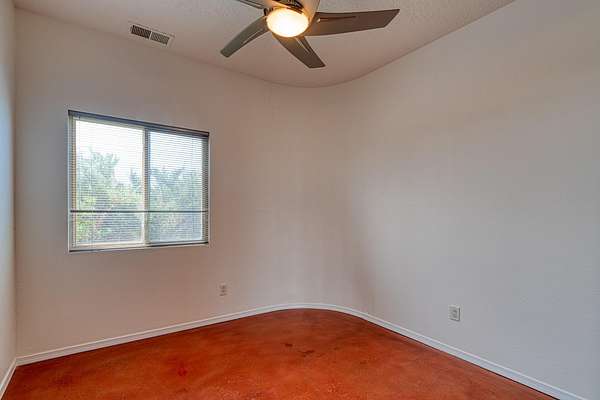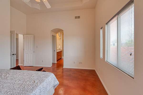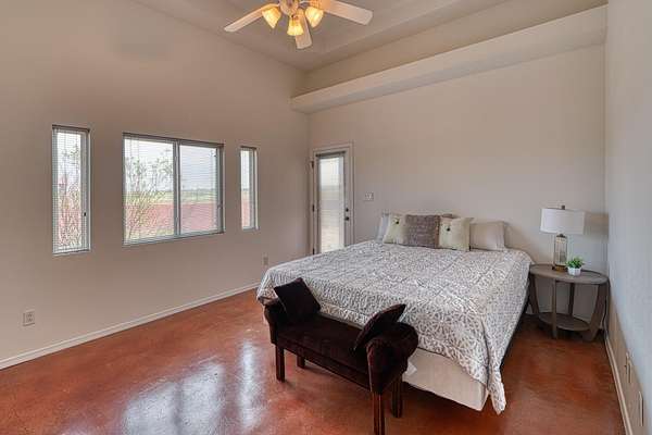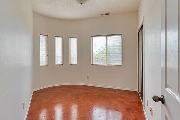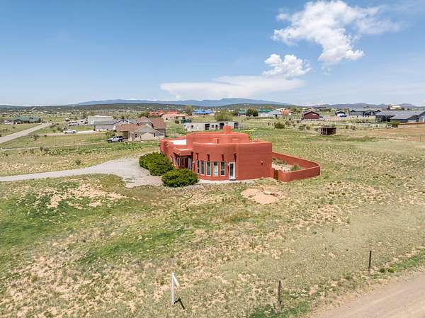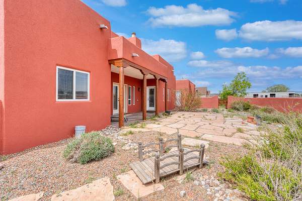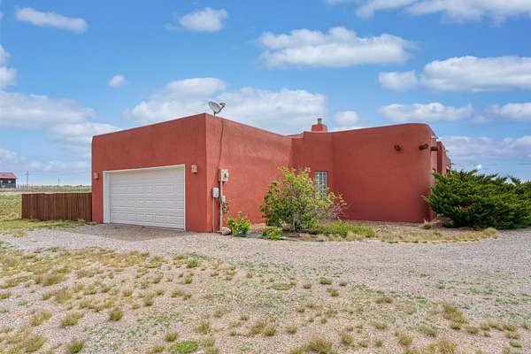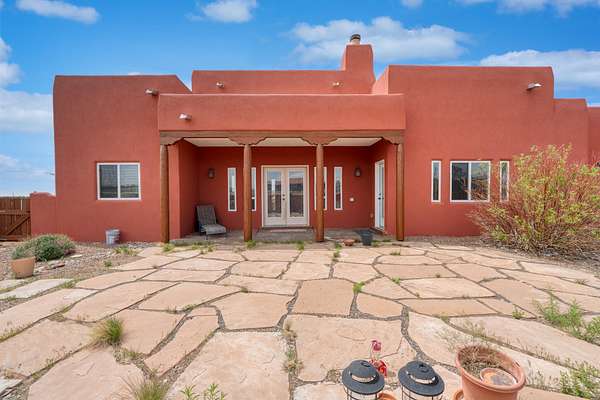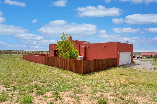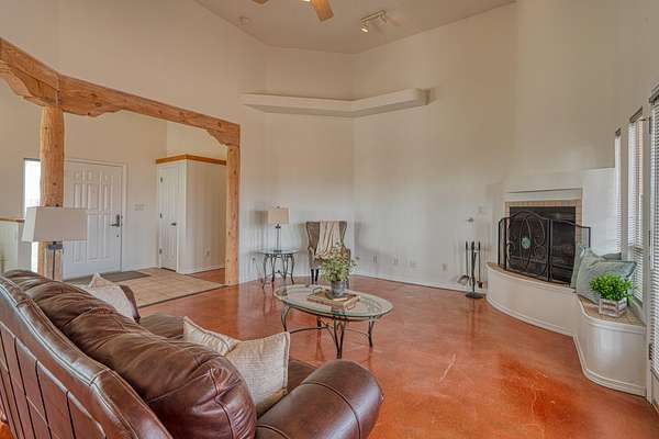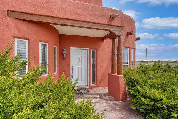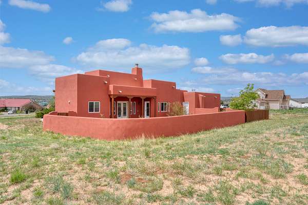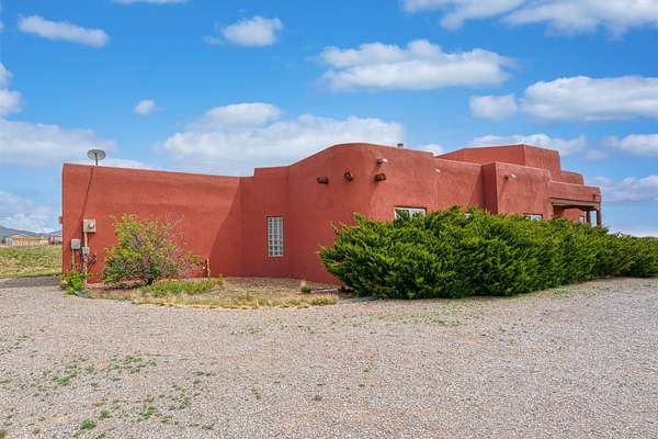 FRESHLY PAINTED & FABULOUS Southwest Santa Fe-style stunner in the heart of Edgewood - Move-In Ready! Hard to find, single story 4-bedroom, 2-bathroom beauty featuring stained concrete floors, curved walls with artistic view windows, and a spacious living area with a soaring ceilings, kiva fireplace, decorator shelves, radial viga beams and corbels. Enjoy a lovely back flagstone courtyard with South Mountain views, FIBER OPTIC INTERNET, community water, natural gas and easy interstate access. Primary suite boasts walk-in closet, jetted tub, separate shower and dual sinks. Recent updates in 2025 include stucco, roof, interior & exterior paint and numerous windows plus new septic tank installed prior to closing. Built In Safe and All Furnishings Can Convey!! So many conveniences nearby!