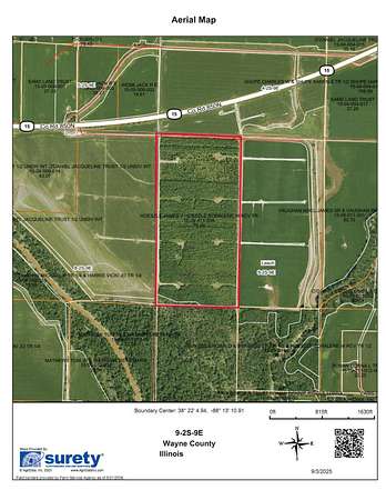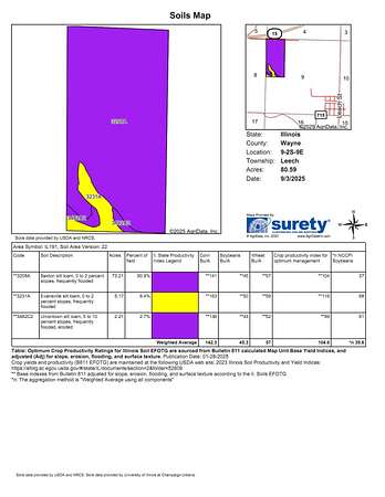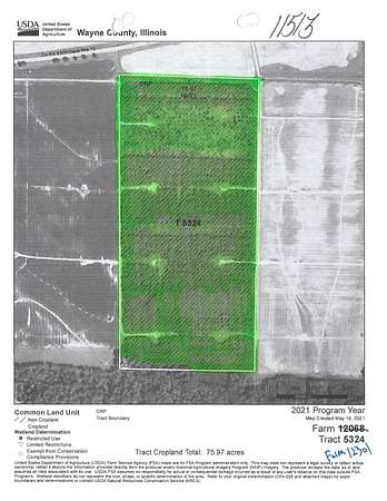 PIN: 15-09-011-004 The West Half of the Northwest Quarter of Section 9, Township 2 South, Range 9 East 3rd P.M., Wayne County, Illinois Directions: From Fairfield, IL go East on Highway 15 7 miles. The property is just south of Highway 15. (Approx. 40mi. E of Mt. Vernon, IL; Approx. 60 miles NW of Evansville, IN) Lot Size: 80 acres Tillable Acres: 75.97 acres in CRP Tree Program (CP23) paying $9,268/yr expires 9/30/2033. The current owner's have taken care of all timber management on this farm which has almost perfect straight crop rows of trees planted every 10?. They have also conducted a CRP tree thinning in May of 2025 and there is no additional maintenance required. This farm has over $74,000 remaining CRP income left on its contract. Mineral Rights: Sellers retain no mineral rights; however, subject to any prior reservations. There are currently multiple producing oil wells on this farm. All oil income and production will transfer to the new buyers. Possession: At closing Rent Agreement: CRP payments will be pro-rated to the date of closing. Soil Types Tillable Acreage: Sexton, Evansville, Uniontown Crop Productivity Index: 104.6 Real Estate Taxes: $2,334.14 (2024 real estate taxes) If you are in the market for a serious hunting/recreation tract with outstanding income then you need to take a look at this farm. The 80 acres in nearly all income producing, and also offers some of the best deer hunting in the area. The established trees provide adequate cover to hold a large population of whitetail. Additionally with open farmland on three sides this is an ideally located tract where the deer with naturally funnel towards. The Little Wabash River is just south of this farm where the large bucks are known to travel. The farm also has well maintained lease roads throughout the property which are ideal for quietly maneuvering during hunting season. Along with outstanding hunting this farm offers amazing income through both CRP and oil production. Hunting tracts with this good of income are nearly impossible to find. This is truly a recreational tract that will help pay for itself.