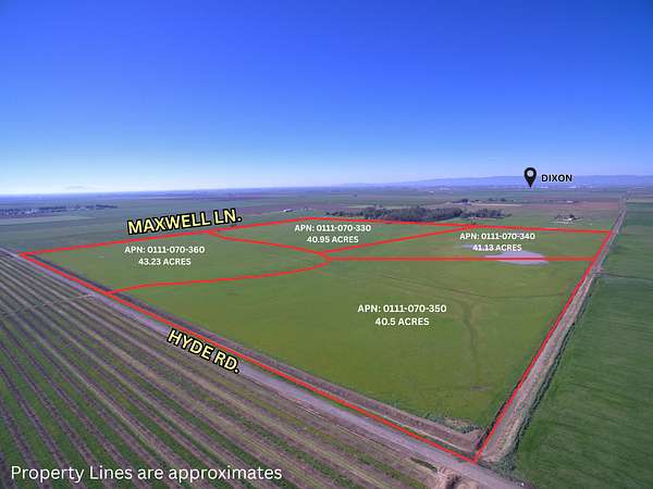 Est $4,355/moNorthern California buildable 40.5 acres less than 5 miles to Davis and in the Davis School District. The property is a flat 41+ acre parcel zoned in Solano County as AG-40, which allows two homes to be built along with a wide array of outbuildings. The land is suitable for livestock, orchards and any other farm animals.There are 3 adjoining 40 acre parcels also available if you are looking for a desirable place for a family compound.