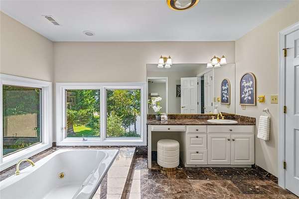 - Bath In Primary Bedroom, Bathroom Rough In, Bookcases, Built In Features, Butlers Pantry, Ceiling Fans, Dining Area, Double Vanity, Granite Counters, High Ceilings, Jetted Tub, Kitchen Island, Separate Formal Dining Room, Soaking Tub, Tray Ceilings, Walk In Closets