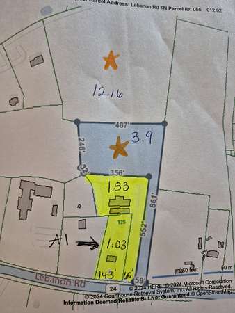 Est $5,195/mo2 Parcels for sale. the 1st one is off of Lebanon Rd. 055 012.02 which is 3.9 acres that possibly be perkable. Will need to do a contingency on perking. The 2nd parcel behind the 1st parcel is 048 069.04 which is 12.6 acres (16.06 approx) Zoned A-1 Residential Single Family Household Units. Water and electricity is available but no sewer. The 2nd parcel is not perkable but great for recreational use etc.