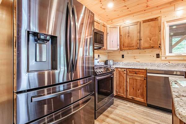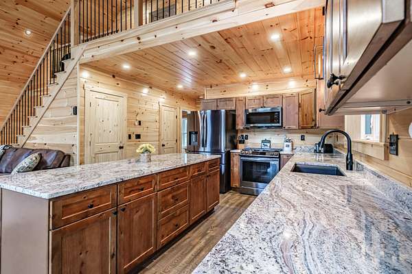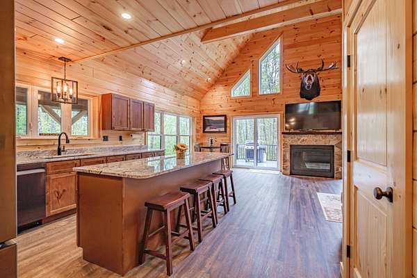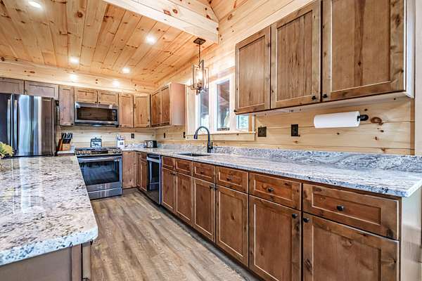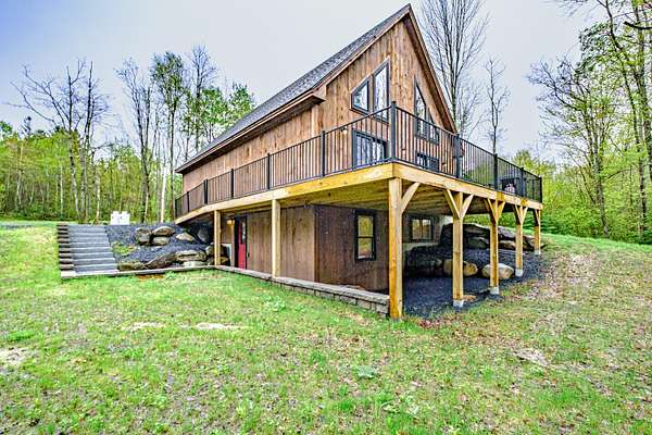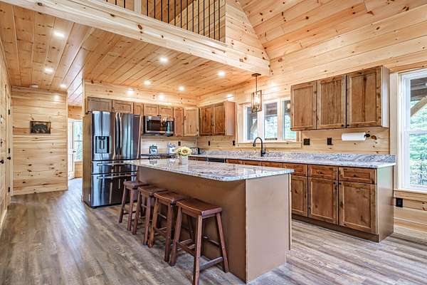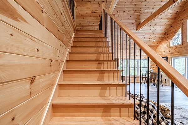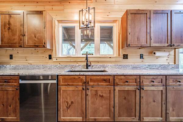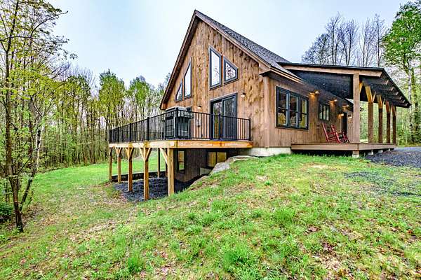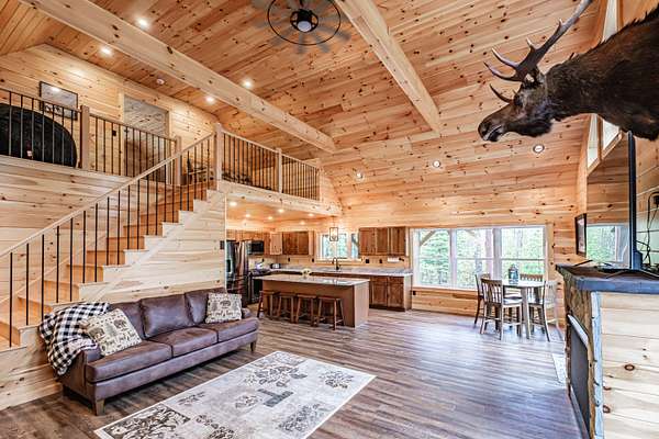 Newly constructed 4-bedroom (3BR septic)/ 2.5-bathroom chalet with easy access to snowmobile/ATV trails and close proximity to Greenville and Moosehead Lake. This lovely home blends the classic charm of a quintessential Maine cabin with modern comforts and conveniences. Built with quality craftsmanship and upscale finishes throughout, enjoy highlights such as striking black windows and sliding glass doors, pine walls and cathedral ceilings, composite decking, granite countertops, spray foam insulation, gas fireplace and an oversized 2-car garage. The thoughtfully designed main level features an open-concept layout that seamlessly connects the kitchen, dining and living areas - ideal for both everyday living and entertaining. The spacious living room showcases soaring cathedral pine ceilings and walls, a cozy gas fireplace and a double set of sliding glass doors that flood the space with natural light and opens to a large composite deck. The kitchen is a true centerpiece, offering granite countertops, an oversized island, abundant cabinetry, a pantry and stainless-steel appliances. The first-floor primary ensuite includes a generously sized bedroom, full bath and walk-in closet. Upstairs, you will find a spacious 20x14 bedroom with space for multiple beds, as well as an open loft that provides additional space for a couch of futon - perfect for overflow sleeping or a bonus sitting area. The finished lower level adds exceptional versatility with two large bedrooms, a full bathroom, spacious living room and a bonus room. Conveniently located just 7-minutes to Indian Hill Trading Post and 10-minutes to downtown Greenville, this property offers the perfect balance of privacy and convenience. Tucked away on a private, dead-end road, you will enjoy peaceful surroundings paired with easy access to shopping, dining and abundant recreational opportunities. Offered fully furnished and turnkey.