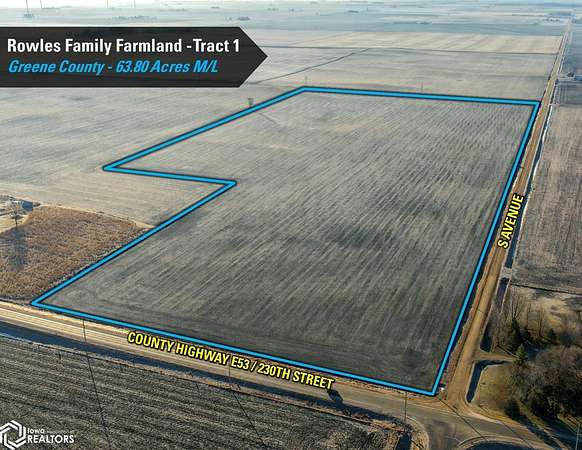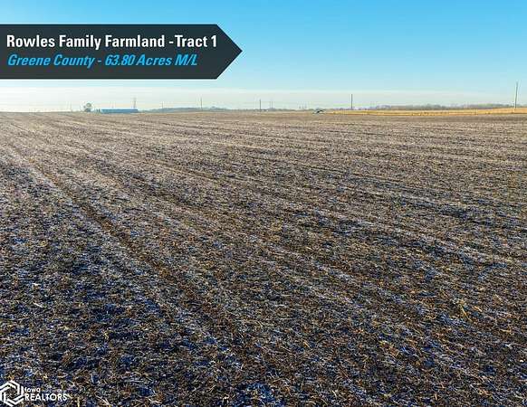 Greene County, Iowa Online Only Farmland Auction - Wednesday February 18th, 2026! I'm pleased to be representing the Rowles Family in the sale their family's 300 acres m/l. Offered as three individual tracts, these farms are located northwest and southwest of Grand Junction, Iowa in Sections 7, 20, and 29 of Junction Township, Greene County, Iowa. Tract sizes range from 63.80 acres to 156.20 acres and would make for great add-on tracts to an existing farming operation or an investment for the Buyer looking to diversify their portfolio or hedge inflation. Tract 1 consists of 63.80 acres m/l located southwest of Grand Junction, Iowa. The farm includes 62.12 FSA NHEL cropland acres and a CSR2 soil rating of 78.7. Prominent soil types include Canisteo clay loam and Nicollet loam with over 65% of the farm carrying a CSR2 soil rating of 83 or higher. Private and county drainage tile is located on the tract. A private 6" tile line lies on the north half of the farm and connects to a 6" county tile line at the property boundary, draining water east off the farm. Three drainage intakes are located on the farm, suggesting additional private tile has been installed. Drainage District #122 borders the farm to the east, and water eventually outlets into an open ditch in the section just north of the tract. The farm is leased for the 2026 growing season, and Buyer will receive all of the 2026 rental income. The total income for 2026 is $15,500 as two payments.