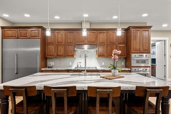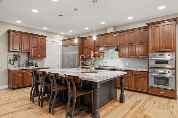 - Dishwasher, Disposal, Double Oven, Gas Range, Hard Surface Counters, Microwave, Refrigerator, Water Softener