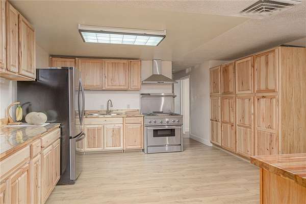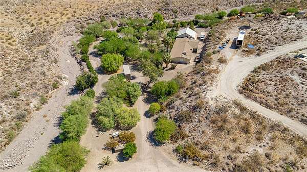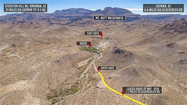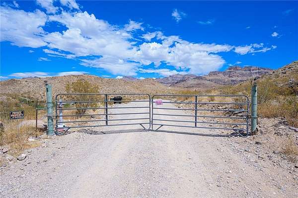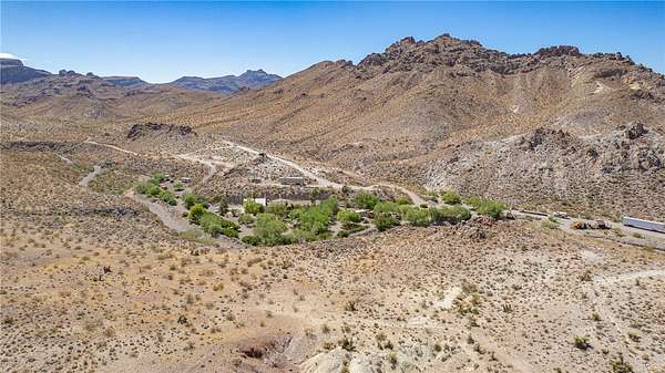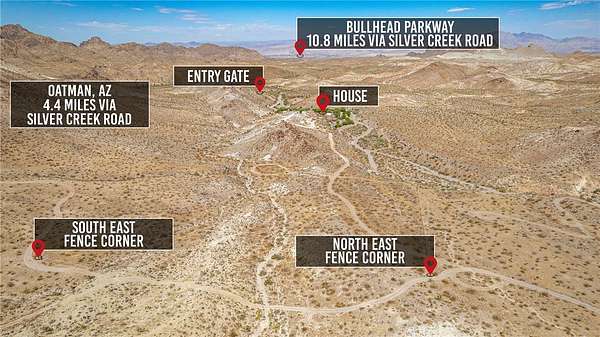 Nestled in the Black Mountains on the edge of the Mount Nutt Wilderness, just 4.5 miles from historic Oatman and Route 66, Silver Creek Ranch is truly one of a kind. Spanning 60+ acres, this completely fenced off-grid estate offers approximately 3,600 sq ft of living space surrounded by Bureau of Land Management land. A lush desert oasis greets you on arrival, with pomegranate, olive, palo verde, and palm trees shading the U-shaped driveway. The main patio showcases stamped concrete and panoramic views of Battleship Mountain. Inside, the expansive great room features walls of windows that frame the desert landscape and lush grounds. The home also offers two beautiful stone fireplaces, perfect for cozying up during mild desert winters. The recently remodeled kitchen includes stainless steel appliances, hardwood countertops, and custom cabinetry. With 3 bedrooms and 3 bathrooms, there s room to spread out and enjoy the privacy of the desert. The property runs on a robust off-grid system with multiple solar arrays, a large battery bank, backup generator, and an exceptional groundwater supply powered by a high-output well feeding a 10,000-gallon hilltop storage tank. Additional areas of flat terrain provides flexibility for future uses, from additional cabins to recreational opportunities. With the proper licensing, the property could even serve as a unique off-road destination, bed-and-breakfast, or event retreat for the thousands of Route 66 travelers who visit Oatman each year. The property is accessed by a self-maintained road provided by a BLM lease. This property is truly a "Must See to Believe". NO TRESSPASSING. PLEASE DO NOT TRAVEL TO PROPERTY ALONE.