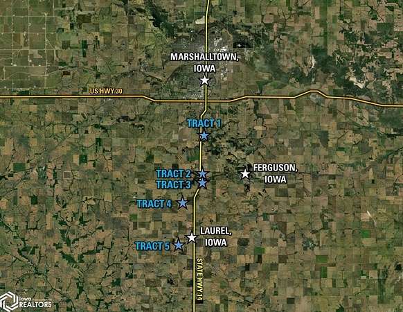 Marshall County, Iowa Online Only Farmland Auction! - BIDDING IS CURRENTLY LIVE and set to conclude on Tuesday, March 3rd, 2026, at 1:00 PM CST! Pleased to present 223.69 acres m/l of productive farmland with building site potential in Southeast Marshall County, Iowa along the State Highway 14 corridor. The sale consists of five productive, tillable farmland tracts located south of Marshalltown, Iowa. Tract 1 consists of 79.46 surveyed acres with 75.60 FSA cropland acres. The tillable acres boast an average CSR2 soil rating of 73.5 and primary soil types of Kilduff silty clay loam, Tama silty clay loam, and Colo-Ely complex with the cropland acres classified as HEL (Highly Erodible Land). Access is from the west off paved State Highway 14. Located in Section 35 of Timber Creek Township, Marshall County, Iowa.