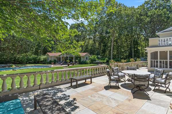 Welcome to *Dancing Oaks*, an extraordinary French Mediterranean estate tucked behind gates on approximately 4 acres in the exclusive Grace Estate of East Hampton. This elegant residence offers a rare blend of timeless European-inspired architecture and modern amenities, all set within one of the most protected and ecologically significant enclaves on Long Island. A winding, formal driveway sets a refined tone on approach, leading to a stately double-door entrance. Step inside to a dramatic two-story foyer with a sweeping staircase and a direct sightline to expansive slate terraces, adorned with balustrade railings. The main level showcases grand entertaining spaces including a formal living room that opens to the terrace, a sophisticated dining room, a media/family room, and a screened garden porch ideal for three-season enjoyment. The first-floor primary suite is a private retreat, complete with a sitting room featuring a gas fireplace, a generous walk-in closet, and direct access to a private terrace. The spa-inspired bathroom includes a jacuzzi tub, a glass-enclosed double shower with six heads and multiple spray features, offering a true at-home spa experience. The chef's kitchen is built for both function and style-equipped with granite countertops, a large center island, wine cooler, dual sinks, hot water dispenser, two dishwashers, top-of-the-line appliances, and an adjacent pantry with additional refrigerator, laundry, and storage. Upstairs, you'll find four ensuite bedrooms with beautifully appointed marble baths and a spacious family room with fireplace overlooking the grand foyer. A separate guest wing includes a three-bedroom suite, ideal for visitors or extended stays. The fully finished lower level offers lifestyle versatility, with space for a screening room, gym, wine cellar, expansive storage, and a family sitting area. Outdoors, the amenities are equally impressive: a Har-Tru tennis court, a heated gunite pool with integrated spa designed to resemble a natural pond (complete with spouting crane fountain and dual stone waterfall), and two guest cottages with kitchenettes, laundry, and outdoor showers-perfect for summer entertaining or private guest quarters. The landscape is a living masterpiece with towering rhododendrons, forsythias, lilacs, hydrangeas, crepe myrtles, and more-all curated to ensure continuous blooms from spring through fall. Over three acres are dedicated to native plants, sustaining local birdlife and wildlife and reinforcing the estate's eco-conscious footprint. The Grace Estate is a 623-acre sanctuary of protected forest, beach, and wetlands. Its preservation is one of East Hampton's greatest conservation success stories, ensuring permanent tranquility and privacy for its residents. As part of this premier enclave, owners enjoy access to a resident-only trail leading to a quiet bay beach with picture-perfect sunsets. With 8 bedrooms and 9 bathrooms in the main home, plus 2 additional poolside cottages, *Dancing Oaks* offers the perfect balance of luxury, comfort, and natural beauty in one of the Hamptons' most coveted settings. Discover refined living with deep roots in conservation and serenity-just moments from the best of East Hampton.