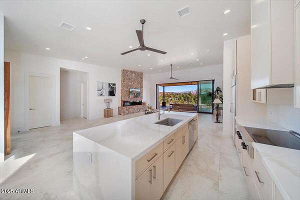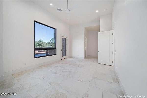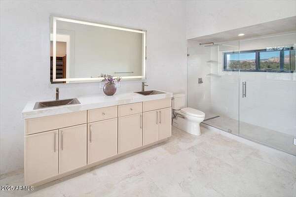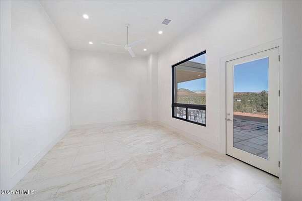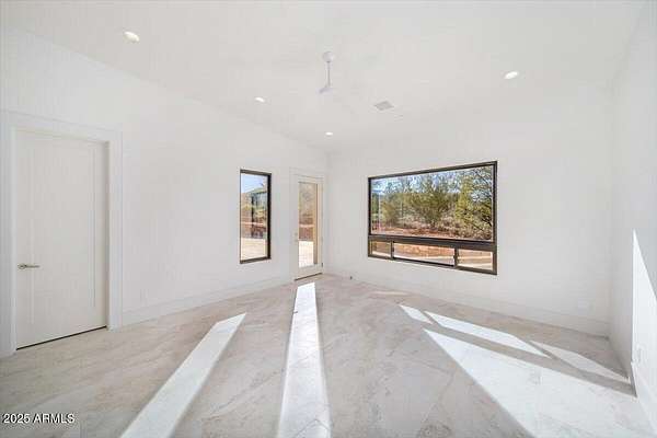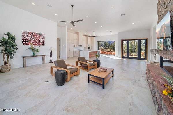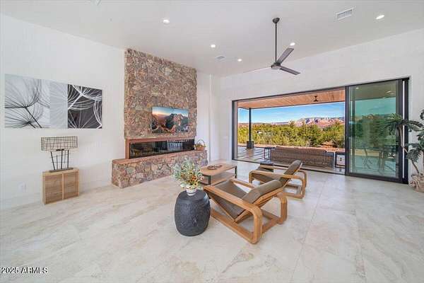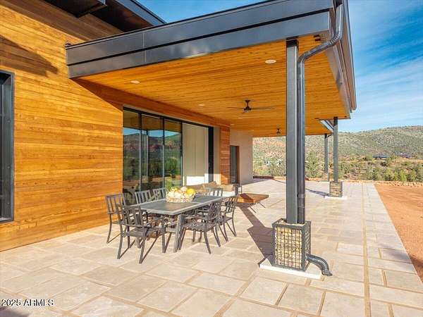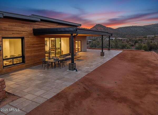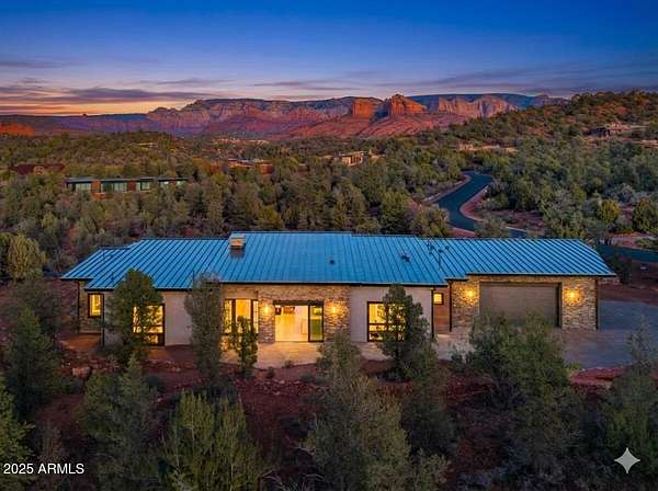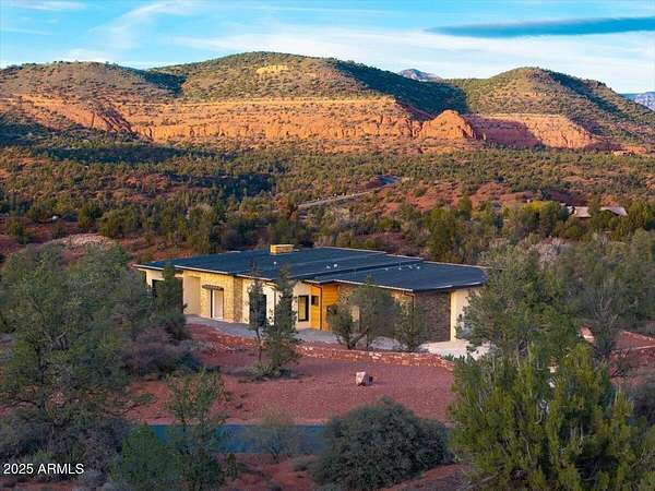 This thoughtfully designed home embodies the best of Sedona living - spectacular red rock views, modern indoor-outdoor living, and a spacious 2ac lot with private access to lush Oak Creek, Red Rock State Park and endless nature trails. Your new home is in historic Cross Creek Ranch, where the sense of peace, authenticity, and quietude is real. The heart of the home is the entertainer's kitchen and gathering area, opening to a large redwood-accented travertine patio with an expansive, fully opening wall of glass doors with breathtaking views of Cathedral Rock...this is where memories of delightful meals & inspired conversations will surely be made. Quality construction materials highly insulated concrete block form (ICF - 8"), metal roofing and natural stone and redwood accents throughout. Just-right-sized rooms, an open kitchen, a primary suite with adjacent den/office/workout room or bedroom, and 2 additional guest suites each with separate entrances opening to dramatic views.. The extended double garage is fitted with upgraded power for future workshop area (220v), and dramatic view windows. Guest suites are also designed for flexibility of use with additional power and plumbing installed for whatever future uses an owner can conceive - art studio, caretaker kitchenette, etc. Well-insulated and designed for cross-ventilation, a/c is rarely required, further adding to the natural peace and quietude of this modern gem. Enter the sweeping drive along curving, well-crafted walls of red rock quarried from the site which set the tone for the exterior spaces. Real stacked-stone accent walls complement the redwood panel details. The extra-thick ICF walls allow for deep window frames and an at grade patio. The landscape is ready for planting with installed drip irrigation infrastructure, approved planting plans, and stone lined water drainage washes. Exterior power and plumbing are in place for your jacuzzi and/or pool. This is all set for you to personalize with your own landscaping preferences. This custom-crafted home's neutral palette is a perfect blank canvas ready for your style. The home's design invites you to sense the pristine high desert surroundings and the wonder of the oasis created by Oak Creek and its network of 1880's irrigation canals. You will have direct access to cool Oak Creek for summer swimming or winter cold plunge, trout fishing and a lazy day frolicking along the creek. Enjoy private access to Red Rock State Park trails, and National Forest land abundant with wildlife. Situated off Red Rock Loop, one of Sedona's most scenic drives, you can enjoy each moment of the 7 minute trip into Sedona. Cross Creek Ranch is a rare natural and historic gem. With lush meadows, Cottonwood and Sycamore trees, amber cliffs, panoramic red rock views and rolling hills, it is truly one of the most spectacular private communities in Sedona. The seller is motivated due to a recent change of plans which presents an opportunity for you to step into a wonderful situation here in a home ready to make your own. Details: Telescoping full-open Western Windows (large doors) and Anderson windows throughout Highly fireproof home. Metal roof, concrete and stone exterior walls, fire-treated Redwood panels and landscaping designed enough away from the house to further mitigate fire danger. Travertine patio, Italian tile and quartz, pebbled concrete aggregate driveway and parking court Neutral color palette Large opening telescoping and sliding glass doors create delightful cross breezes Additional 220V wiring for future uses in guest suites and in garage workshop area Wired and plumbed for Jacuzzi and or pool. Landscaping irrigation is set up throughout the site's several landscaping areas Red rock walls are set with concrete and rebar, all red stone was sourced from the site Real Stacked stone accent walls (not cultured stone panels) Connect to Fiber optic cable (Century Link) recently installed in Cross Creek Ranch.