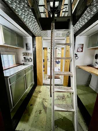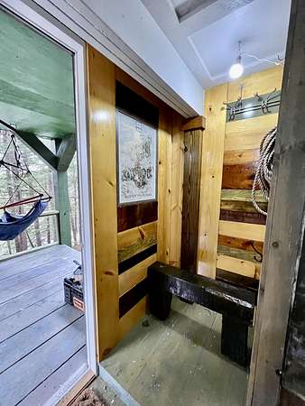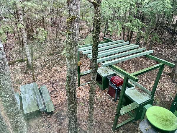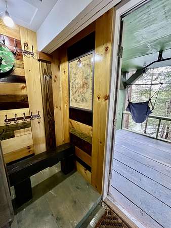 Park at the end of the driveway by the sign and walk in. Off-Grid Riverfront Retreat - Hand-Built Cabin. Nestled on 3.4 wooded acres with 215 feet of frontage along the tranquil Piscataquis River, this hand-crafted, multi-level cabin blends rustic charm with thoughtful comfort. Located just 40 minutes from Bangor—this unique property offers peaceful seclusion for a getaway or retreat. Designed with Maine's seasons in mind, the cabin features fully insulated 2x6 walls, 2x12 floors, a wood stove that keeps things warm and cozy when it gets chilly. The interior includes a changing area with double closets, a new composting toilet, and a manual sink system for hand washing and teeth brushing. Cooking is done in the dedicated outdoor kitchen, equipped with a propane grille. A covered outdoor shower and a 660-gallon rainwater catchment system (2 x 330-gallon tanks) support your off-grid lifestyle. Solar-power for lighting provides sustainable, low-impact illumination throughout the property. There is NO septic, well, or refrigeration in place. Access is via a private drive which needs some improvement in order to be able to drive in. Parking area is a short 250-foot footpath to the cabin. While the seller reports visible boundary pins, there is no formal survey on file. Whether you're a nature enthusiast, seeking a quieter pace of life, or exploring alternative living, this off-grid riverfront retreat offers a rare chance to unplug and reconnect—on the water, under the stars, and fully off the grid.