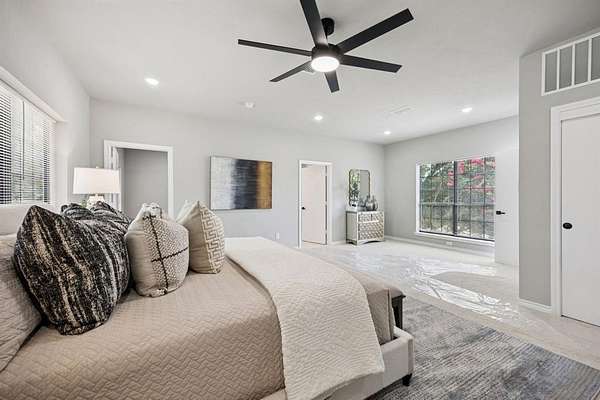 The interior features an open and bright layout, updated flooring, fresh paint, modern fixtures, and a fully renovated kitchen with quartz countertops and stainless steel appliances. The first floor includes a primary suite plus three additional bedrooms and two full baths. The upstairs primary suite offers a large spa-style bath with walk-in shower, freestanding tub, and dual vanities, along with a spacious flex room ideal for an office, media area, or playroom.