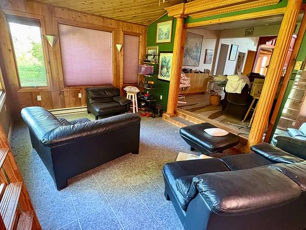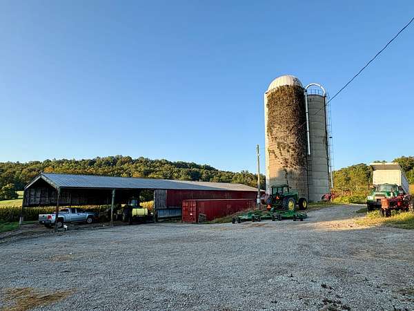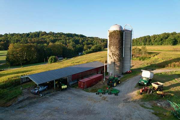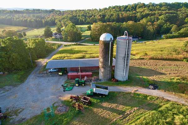 The property features a comfortable home, a large detached garage, and a traditional farm barn with silos, providing ample storage and utility for agricultural operations. With over 2,500 feet of road frontage along Route 119, the farm combines seclusion with convenience and long-term potential.