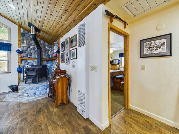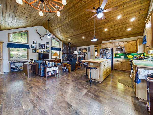 This stunning horse property boasts over 20 acres of land, fully fenced, and overlooked from the main house. The pasture is well-maintained, providing them with ample space to graze and roam plus some mature apple trees. The main house features 3 bedrooms and 2 bathrooms, additionally, there is a cozy sleeping cabin with its own bathroom, ideal for accommodating guests. Inside the main house, you'll find beautiful custom cabinetry made from knotty alder, adding a touch of rustic charm to the space. The vaulted ceilings create an open and airy atmosphere, while the large, covered deck offers stunning views of the surrounding landscape. Equipped with ceiling fans, the deck is the perfect spot for hosting family gatherings and enjoying the outdoors.