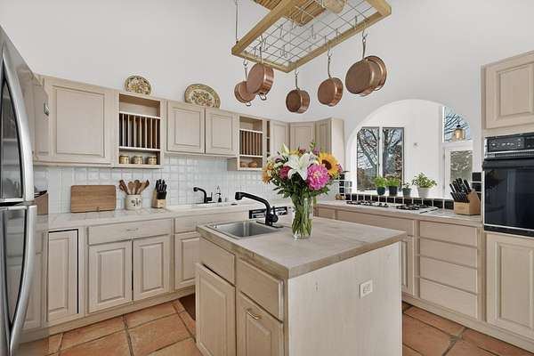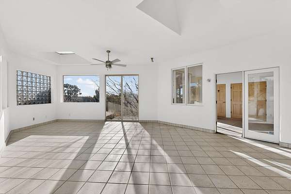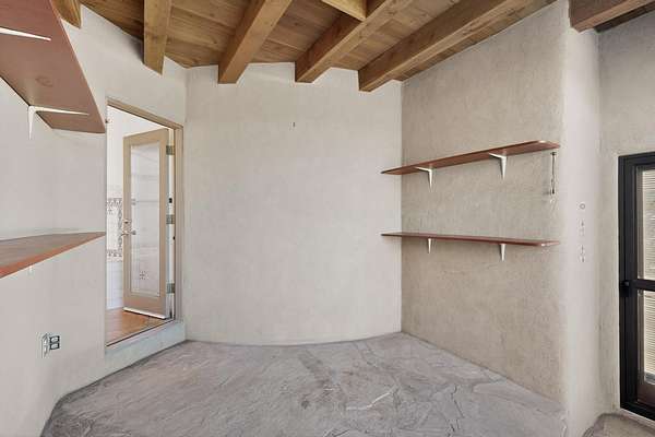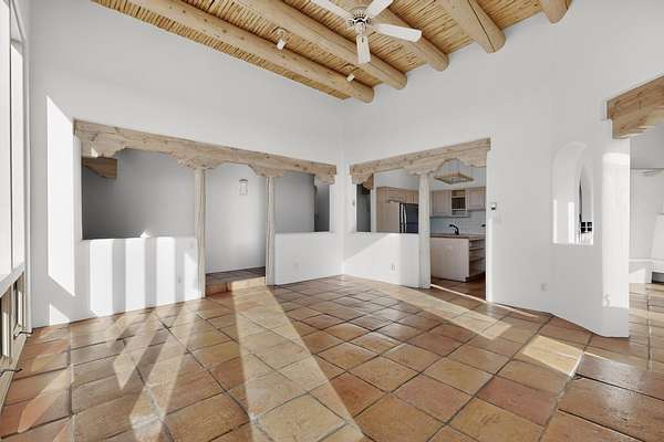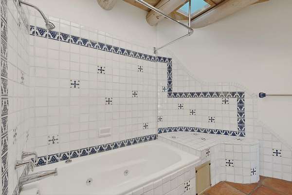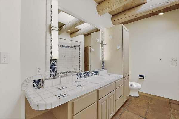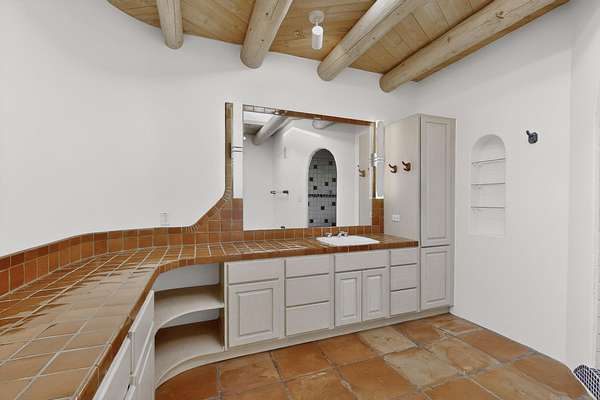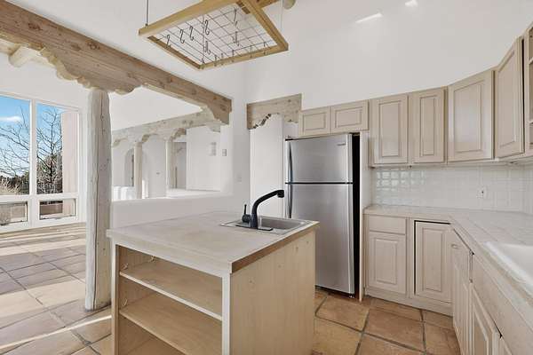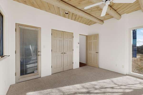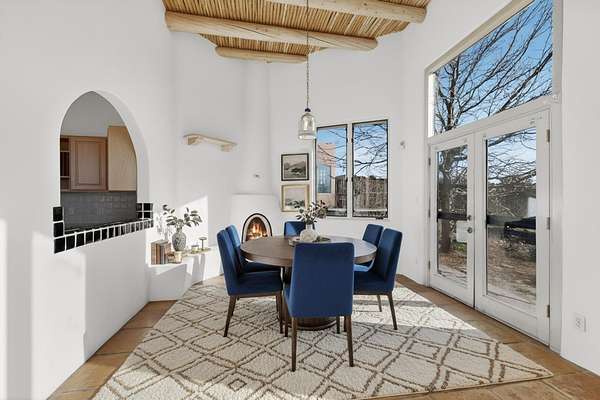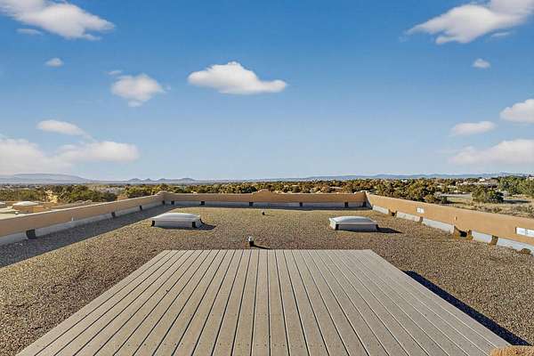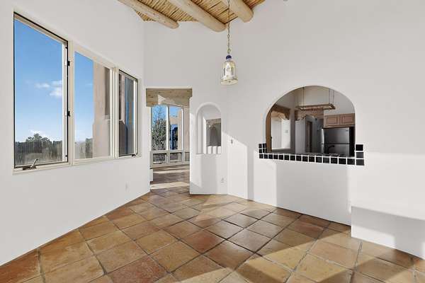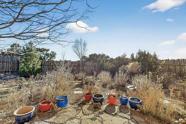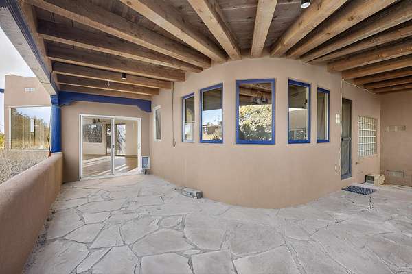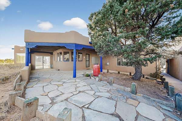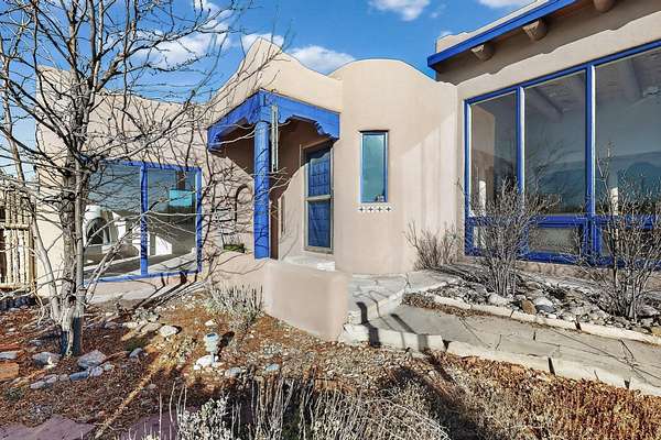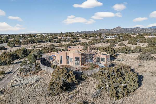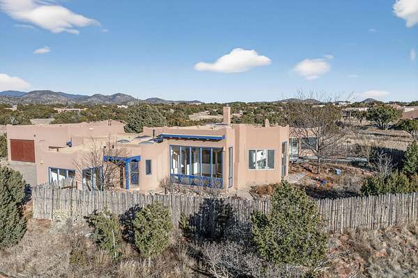 Lovely Eldorado home, situated on an expansive and beautifully landscaped almost 2-acre lot, is filled with natural light and exudes Santa Fe charm. Enjoy panoramic mountain views and amazing sunsets from inside the home and multiple outdoor areas enclosed by coyote fencing and flagstone walk-ways. Offering 2 bedrooms and 2 bathrooms with approximately 2800 square feet, the home features versatile areas perfect for a range of uses. A heated flex space (with gas stove) with appx 390 sqft, separate entrance and direct access to the home provides the ideal setting for a studio, office, workout room, or playroom. Off the spacious primary suite, you'll find a cozy office or sitting room with built-in desk space, as well as a large, light-filled appx 550 sqft unheated room with direct outdoor access-perfect as a work-out room, sitting/TV area, or relaxation space. There is ample storage throughout. The inviting living room boasts soaring ceilings with vigas, a kiva fireplace, and abundant natural light. The owner's suite includes a fireplace and ensuite bath with separate tub and large walk-in show all offering a serene retreat. Car enthusiasts will love the oversized garage (approx. 1,365 sq ft) with room for up to six cars & possibly an RV. Additional highlights include: 4 fireplaces-Abundant skylights-Radiant heat (we have been told not Kitec or Entran II)-Wood doors-Large laundry room with closet & washer/dryer-Saltillo tile floors-Rooftop viewing deck-Vigas in almost every room including bathrooms-Nichos-Banco-Corbels-Archways-Ceiling fans-Newly paved Frasco Rd-Multiple decks and sitting areas and more. This unique property combines Southwestern character with extraordinary versatility and spectacular views.