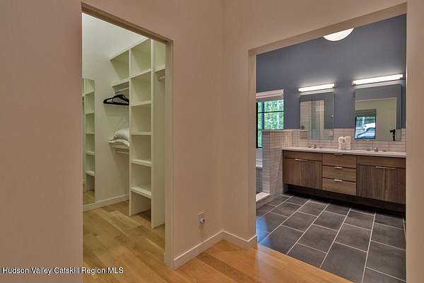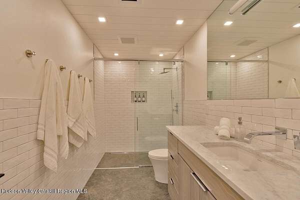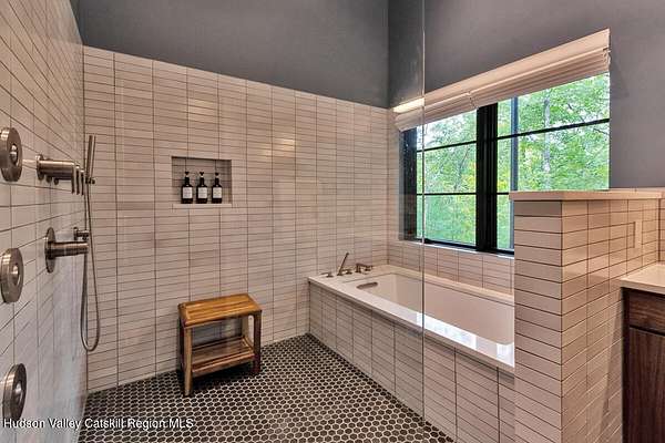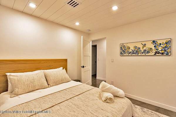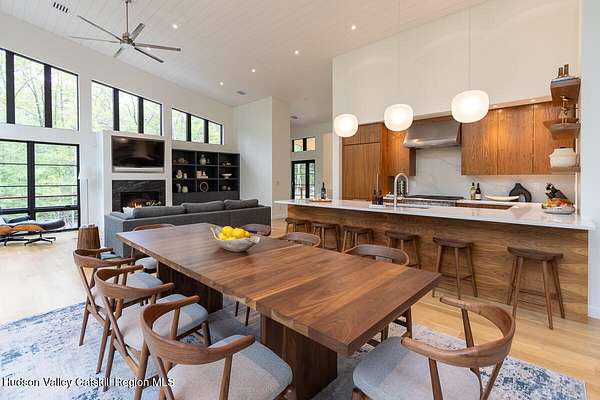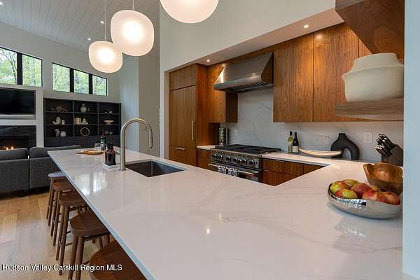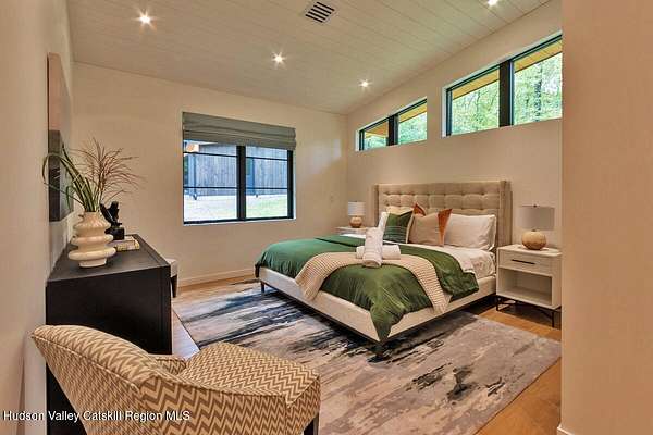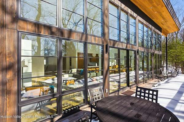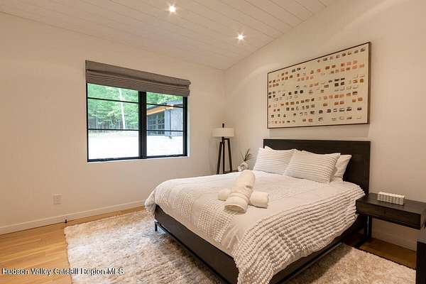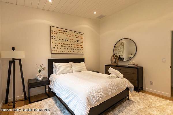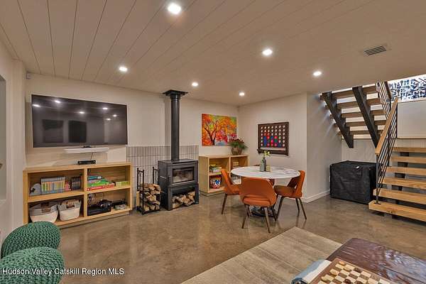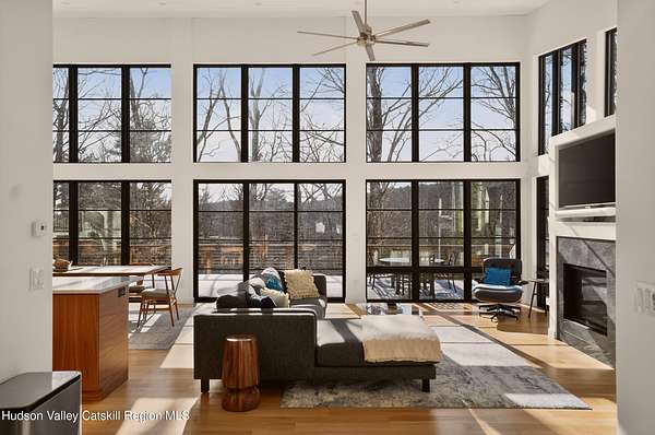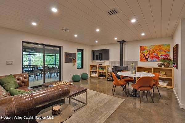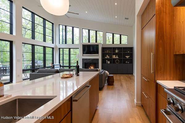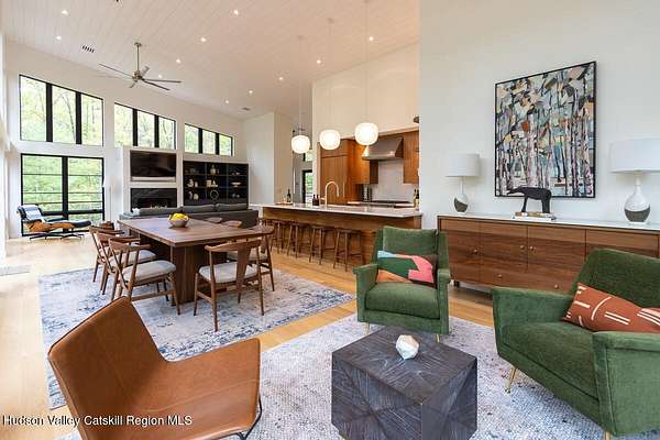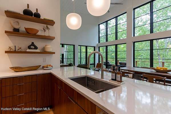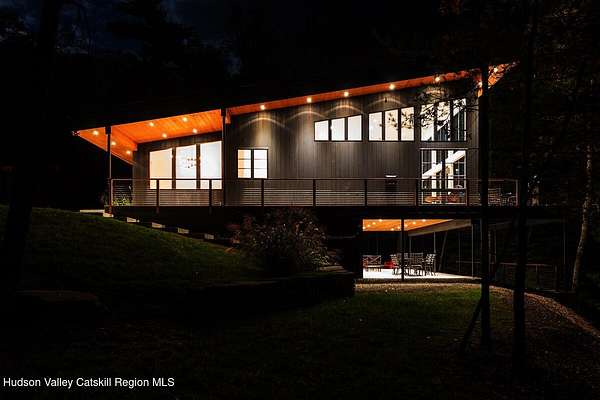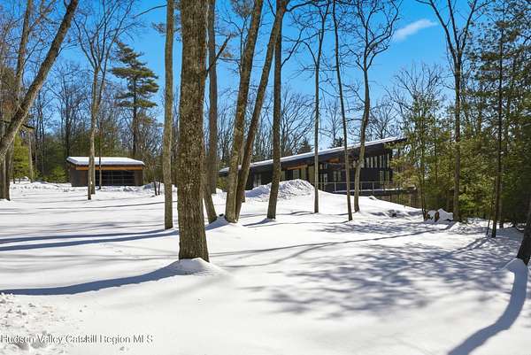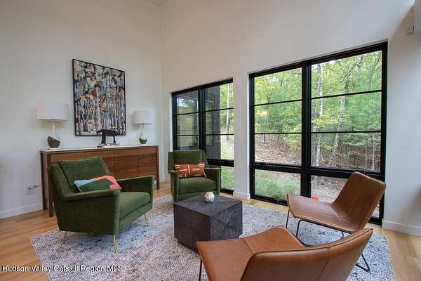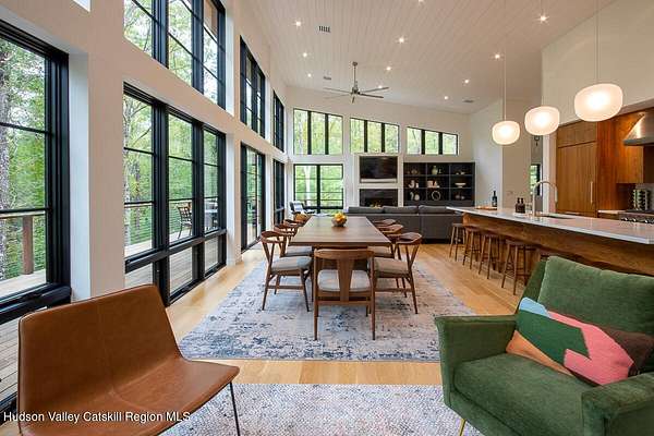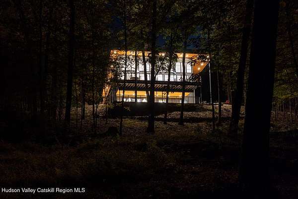 Completed in 2021 and thoughtfully maintained, this forest-set retreat offers a rare combination of craftsmanship, privacy, and refined comfort. Perched atop a private road in one of the Hudson Valley's most sought-after towns, this home feels intentionally removed, quiet, wooded, and deeply peaceful. Inside, the home unfolds as a light-filled sanctuary. Soaring vaulted ceilings and expansive windows frame the surrounding forest, creating a subtle treehouse effect that shifts beautifully with the seasons. The open main level centers around a dramatic great room with fireplace, flowing seamlessly into the kitchen and dining areas, spaces designed as much for gathering as for quiet retreat. Spanning over 3,000 square feet with four bedrooms and three full baths, the layout balances generous scale with thoughtful intimacy. The kitchen is both elegant and functional, with rich wood cabinetry, ample counter space, a generous pantry and sculptural lighting that anchors the island as a natural gathering point. A wall of glass opens to the wraparound deck, extending the living space outward and inviting long dinners under the canopy. The primary suite offers a spacious and serene retreat, complete with a spa-caliber bath and refined finishes that echo the home's quiet sophistication. A second main-level en-suite bedroom ensures comfort and privacy for guests. Downstairs, the fully finished walk-out level with polished, heated concrete floors creates an inviting extension of the home. Two additional bedrooms and a full bath are complimented by polished concrete floors, a wood stove, extra large laundry room and flexible lounge space. It easily accommodates movie nights, weekend guests, and multigenerational living. Outdoor living is equally considered. Wraparound Ipe decking overlooks bluestone steps and stacked stone walls, which lead to a fire pit tucked among the trees. The covered patio, finished with a warm wood ceiling and recessed lighting, creates an all-season entertaining space. The surrounding acreage offers privacy, room to roam, and capacity for further enhancements such as a pool or expanded gardens. Arrive and find every detail has been considered, including a detached two-car garage and whole house generator to ensure uninterrupted comfort in every season. Modern systems, energy-efficient construction, and thoughtful infrastructure provide quiet confidence behind the scenes. From reliable climate control to a top-of-the-line water filtration system to well-planned storage and durable materials chosen for longevity, the practical elements have been executed with the same care as the design, offering ease, security, and low-maintenance ownership for years to come. Though it feels completely immersed in nature, the location is exceptionally convenient. Minutes to Stone Ridge, High Falls, and Accord, with easy access to Inness, Westwind Orchard, Arrowood Farms, the Ashokan Reservoir, and the Mohonk Preserve. Approximately 20 minutes to Woodstock and Kingston and under two hours from the George Washington Bridge. A refined Hudson Valley retreat, grounded in its natural setting and designed for both celebration and stillness.