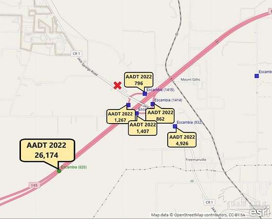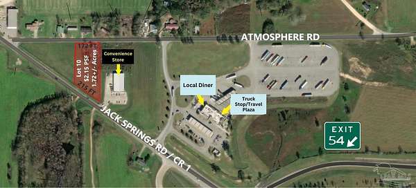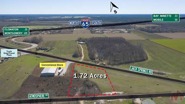 Unlock Your Business's Potential in Atmore, AL - HIGH TRAFFIC AND VISIBILITY! Discover the ideal location for your next business venture or private homestead just feet from Interstate 65! This 1.72+/- acre property is strategically situated just off the interstate, across from the Poarch Creek Indian's (PCI) Creek Travel Plaza, PCI's NEW $15 MILL DOLLAR meat processing facility & a mere half-mile from the federally recognized Poarch Creek Reservation.. This property is level, cleared, & ready to build on, boasting 387 ft of paved road frontage on Jack Springs Rd & Atmosphere Rd. Some city utilities are available for added convenience. BONUS: OPPORTUNITY ZONE! Take advantage of being in an Opportunity Zone which offers tax incentives & contributes to community development, giving both financial & social impact opportunities for investors. With PCI's Perdido River Farms' upcoming state-of-the-art meat processing facility set to launch in Spring 2024, the area is poised for a surge in jobs & economic growth. This facility will process up to 125 cattle/week, providing a boost to employment opportunities. The property, only 1,600 ft from I-65, boasts exceptional visibility & high traffic, averaging 26,174 daily passersby, including travelers, truckers & locals. In addition to interstate location, the property enjoys traffic from the success of neighboring businesses like Dollar General; local staple, Warehouse Market; & Creek Travel Plaza, one of the largest truck stops in the region. With NO ZONING LIMITATIONS, Jack Springs Road offers endless possibilities, be it a hotel, retail store, office, or self-storage facility. It's Perfectly Positioned - Only One Exit from Windcreek Casino & Hotel & an easy 10-minute drive to downtown. As the largest city in Escambia County, Atmore is dedicated to growth & redevelopment. Over $90 million in capital investment projects have recently been brought to the city, welcoming 48+/- new businesses. Don't Miss Your Opportunity-Act Now!