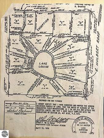 Est $1,789/moFifteen untouched acres that abut hundreds of acres of State land in Interlochen, MI. Approximately 285 ft of Lake Louise frontage and views. Lot is heavily wooded, partially wet with approximately 8 buildable acres. Lot "J" on Survey provided.
