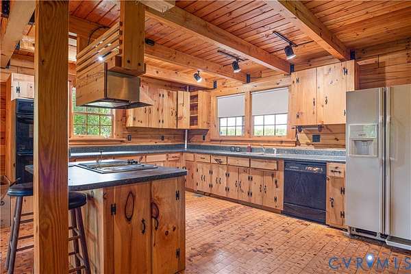 - Balcony, Beamed Ceilings, Breakfast Area, Ceiling Fans, Dining Area, Fireplace, High Ceilings, Kitchen Island