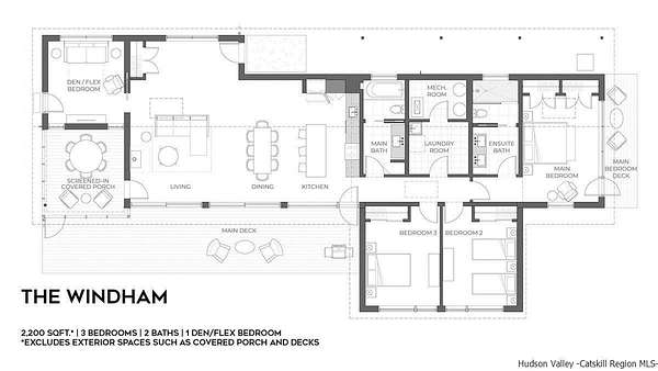 Welcome to South Hill, a modern community with luxurious homes immersed in the Catskills. Located in Ulster County, South Hill is at the forefront of a new generation of Upstate homes. Designed by the award winning architects at Mapos, each home is inspired by the dynamic landscape of South Hill and has been crafted with the utmost attention to detail while allowing you a high degree of control to make this your home. The Windham is a 2200 square foot home designed with clean and modern finishes, natural textures, local materials, super-insulated walls and roof for low maintenance, environmental impact and energy usage. This single-story home integrates with the natural landscape and is offered on 3.41 wooded hickory and hemlock acres with seasonal mountain views which can be made year round with minimal clearing and frontage on South Hill Rd and Red Rock Road. Featuring a large and open Living/Dining/Kitchen space with 12.5 ft ceilings for gatherings. Two bedrooms can be found off of the corridor and across to a full bathroom and separate laundry room and mechanical space. The main bedroom and bathroom suite is placed at the opposite end of the home and opens onto the landscape. The den/flex room has a screened in porch. The home includes double pane insulated windows, 6' white oak floors, hemlock ceiling in main room, kitchen island, Fisher Paykel series 7 kitchen suite, LG Ultra washer and dryer, Stuv wood burning stove, motorized skylights, chrome Kohler Purist fixtures, high efficiency ducted heating and cooling system, and a storage attic. The exterior is covered with red cedar siding that will naturally weather over time and a standing seam metal roof with extended eaves. Two decks are also included - one 12 x 48 off of the living / dining rooms and a main bedroom deck. Add-on amenities include a 550 sf guest house, a detached 2-car garage (or 1-car garage and studio), in-ground swimming pool, wood-fired sauna, outdoor kitchen, outdoor shower and a firepit. Located less than 2 hours from New York City, South Hill is optimal for weekend getaways, 4-season adventures, or a lifetime. Offering this new construction opportunity to build your home on a property with some of the most breathtaking views in the Hudson Valley. Access to 30 acres of common open space and a community barn. A full brochure is available upon request.