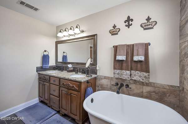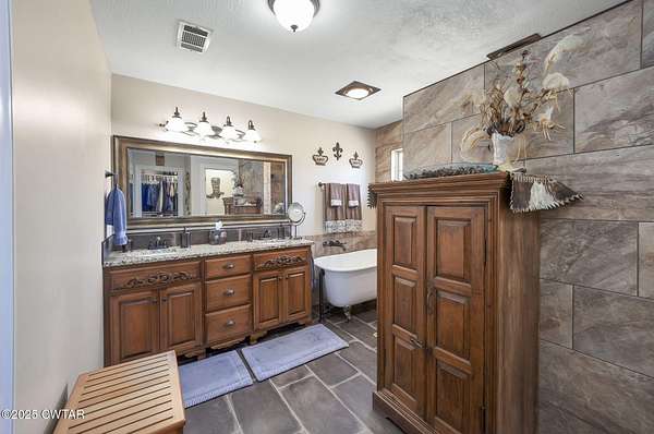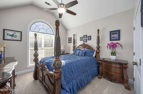 - Breakfast Bar, Ceiling Fan(s), Ceramic Tile Shower, Commode Room, Crown Molding, Double Vanity, Eat-In Kitchen, Granite Counters, High Ceilings, Knocked Down Ceilings, Open Floorplan, Pantry, Primary Downstairs, Soaking Tub, Vaulted Ceiling(s), Walk-In Closet(s)