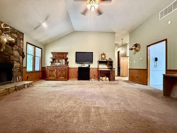 Unique one-of-a-kind layout with rustic charm and cozy comfort! This cedar and stone-sided tri-level home nestled on 2 wooded acres with mature trees and privacy offers 3BR/2.5BA plus heated / cooled finished walkout basement. Bedrooms and full baths are located upstairs (6 steps). The spacious primary suite with french doors leading to balcony overlooking the yard offers, dual closets and a private bath with stand-alone shower. Main level features hardwood entry, a half bath, large great room with stone fireplace, and a light-filled kitchen with island including prep sink and gas cooktop, plethora of cabinetry, dining space, and access to the oversized back deck with views of the lush backyard. Laundry room and extra living space down. Termite/pest treatment just completed and septic recently pumped and serviced.