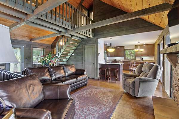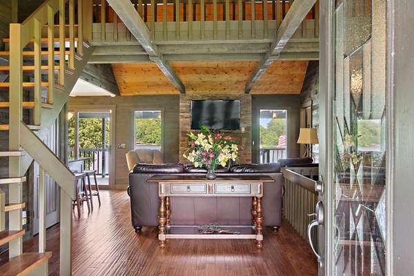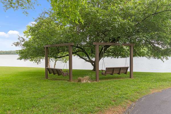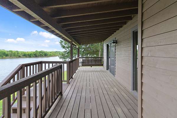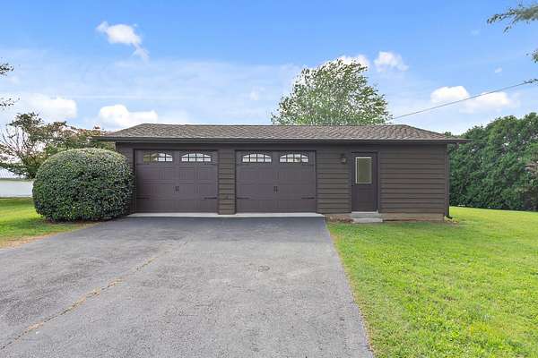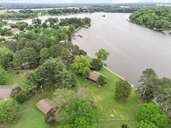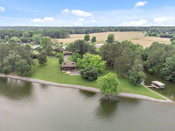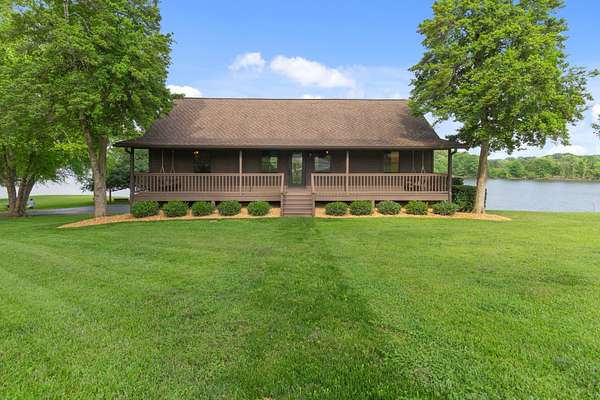 Welcome to your own private oasis situated on 1.99 acres of level lakefront property on Tims Ford Lake. This unique property has so much to offer! With over 800 feet of lakefront shoreline and a gentle slope to the water the views are endless. This land has been surveyed so that you can have the option to build another home or guest home with its own separate 1/2 acre lot and dock permit. You have lake views from every window in the existing home. There is ample space to store your vehicles and lake toys or work on projects with two detached garage/shops as well as the attached 2-car garage. The rustic charm has an inviting feel to it and has plenty of room for guests with two separate living room areas, 4 bedrooms (2 of those being primary suites,) and 4 baths total. The back porch extends the length of the home and offers the most amazing views.