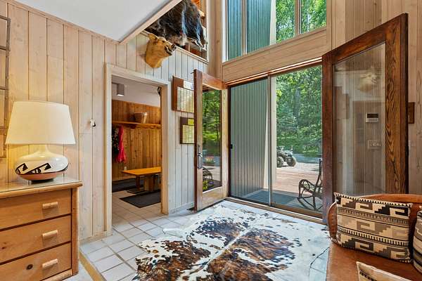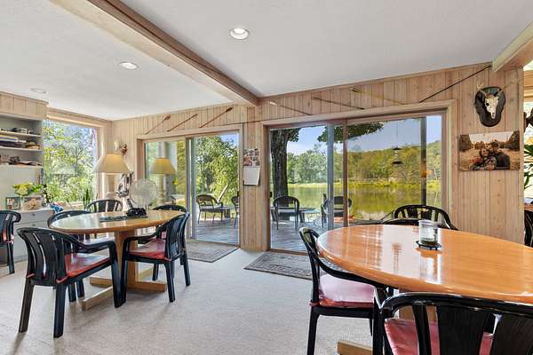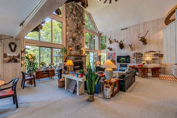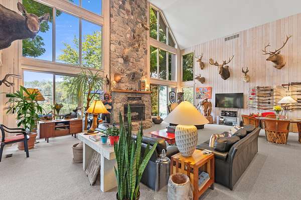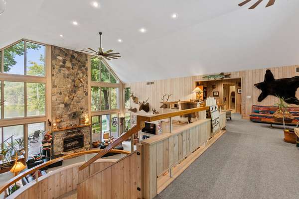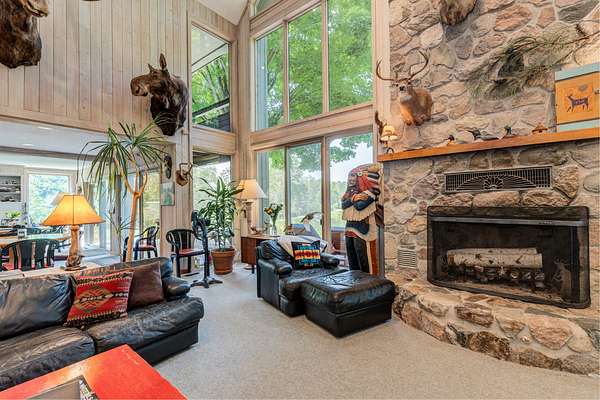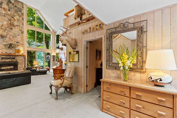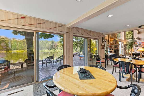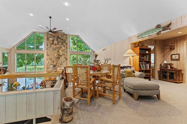 The great room has an impressive wood burning stone fireplace and wet bar. The wall of windows and door walls allow for exceptional views of the spring fed pond and mother nature.